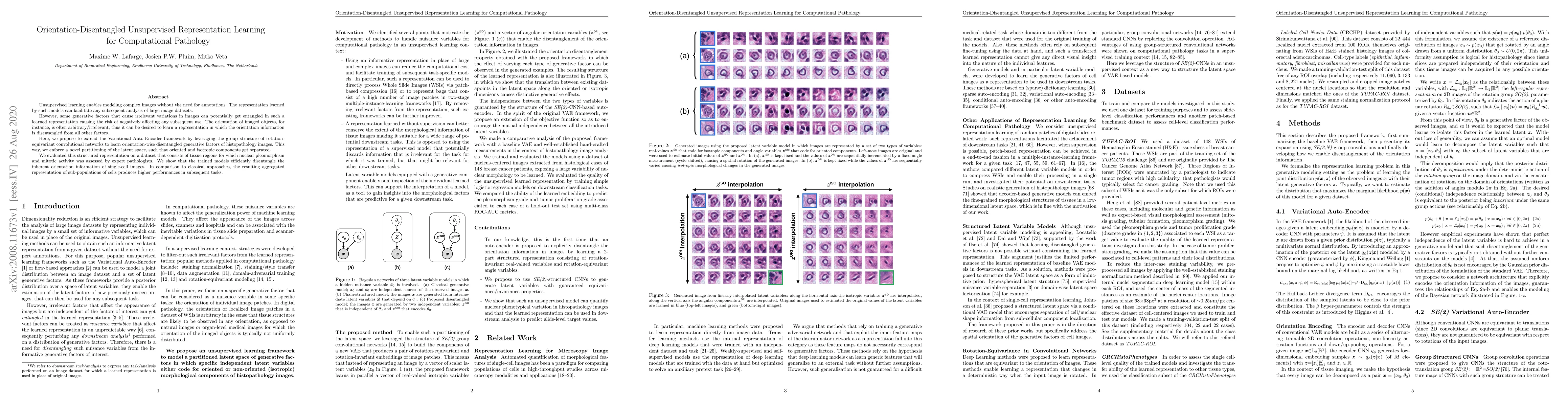 This paper proposes an unsupervised learning method using a Variational Auto-Encoder enhanced with rotation-equivariant convolutional networks to disentangle orientation from other factors in histopathology images. The approach leads to better performance in downstream tasks compared to traditional methods.