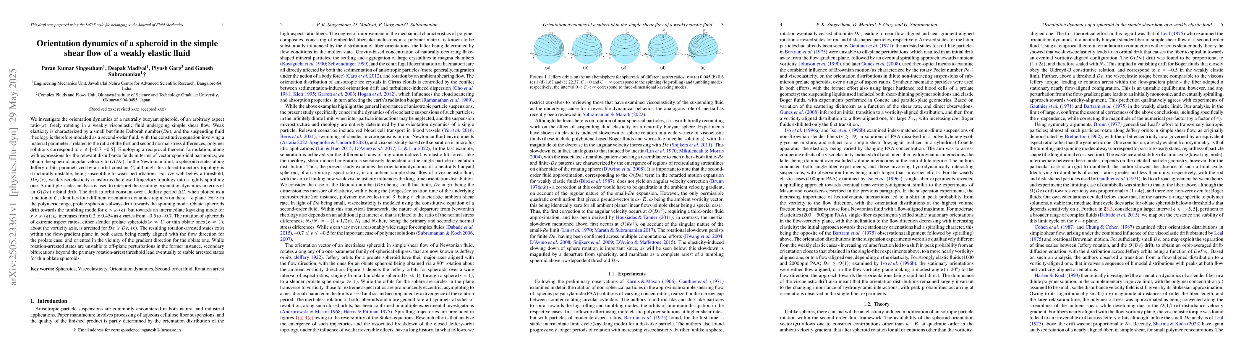 Researchers investigated how a neutrally buoyant spheroid rotates in a weakly viscoelastic fluid undergoing simple shear flow, revealing four orientation dynamics regimes based on aspect ratio and elasticity, with prolate spheroids drifting towards spinning and tumbling modes.