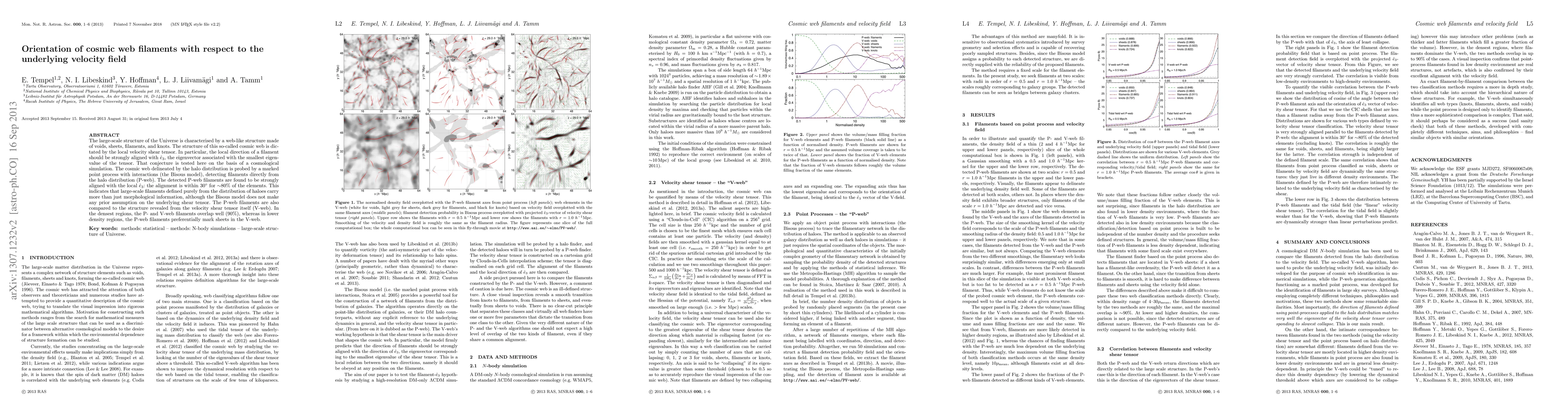 The large-scale structure of the Universe is characterised by a web-like structure made of voids, sheets, filaments, and knots. The structure of this so-called cosmic web is dictated by the local velocity shear tensor. In particular, the local direction of a filament should be strongly aligned with e3, the eigenvector associated with the smallest eigenvalue of the tensor. That conjecture is tested here on the basis of a cosmological simulation. The cosmic web delineated by the halo distribution is probed by a marked point process with interactions (the Bisous model), detecting filaments directly from the halo distribution (P-web). The detected P-web filaments are found to be strongly aligned with the local e3: the alignment is within 30 degree for 80% of the elements. This indicates that large-scale filaments defined purely from the distribution of haloes carry more than just morphological information, although the Bisous model does not make any prior assumption on the underlying shear tensor. The P-web filaments are also compared to the structure revealed from the velocity shear tensor itself (V-web). In the densest regions, the P- and V-web filaments overlap well (90%), whereas in lower density regions, the P-web filaments preferentially mark sheets in the V-web.