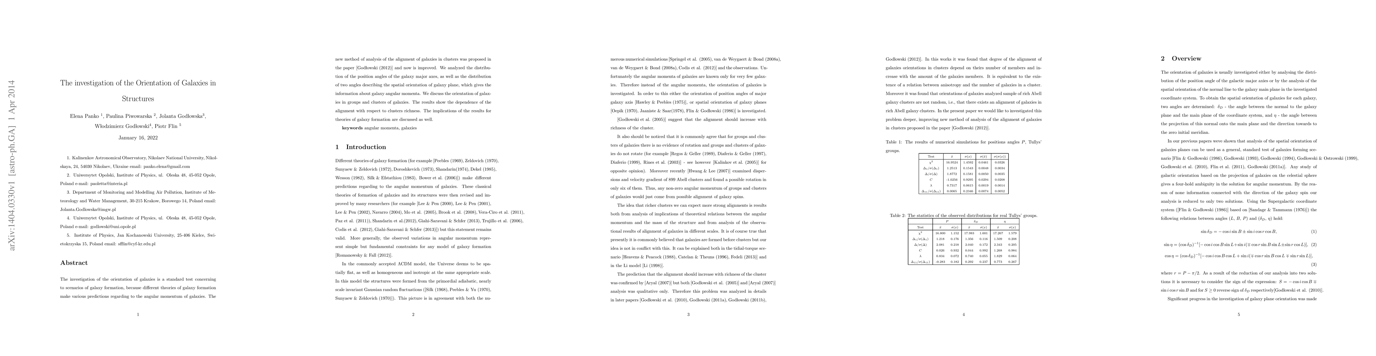 The investigation of the orientation of galaxies is a standard test concerning to scenarios of galaxy formation, because different theories of galaxy formation make various predictions regarding to the angular momentum of galaxies. The new method of analysis of the alignment of galaxies in clusters was proposed in the paper Godlowski (2012) and now is improved. We analyzed the distribution of the position angles of the galaxy major axes, as well as the distribution of two angles describing the spatial orientation of galaxy plane, which gives the information about galaxy angular momenta. We discuss the orientation of galaxies in groups and clusters of galaxies. The results show the dependence of the alignment with respect to clusters richness. The implications of the results for theories of galaxy formation are discussed as well.