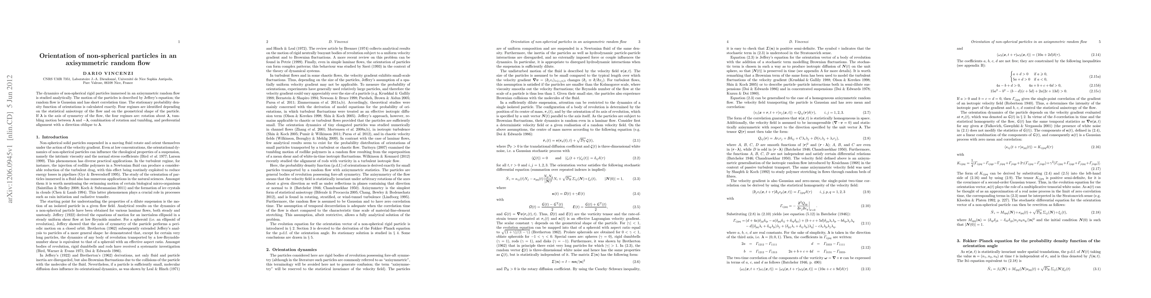 This paper analytically investigates the dynamics of non-spherical particles in an axisymmetric random flow, using Jeffery's equation to describe particle motion. It identifies four distinct regimes of particle orientation based on flow anisotropy and particle geometry, including rotation, tumbling, and preferential alignment.