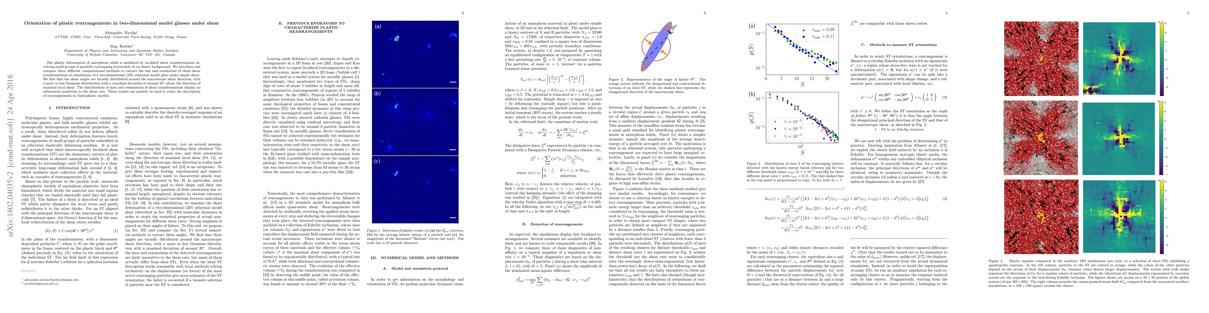 Researchers studied plastic deformation in 2D glass models under shear, finding that shear angles are broadly distributed around the direction of maximal local shear with a standard deviation of about 20 degrees.