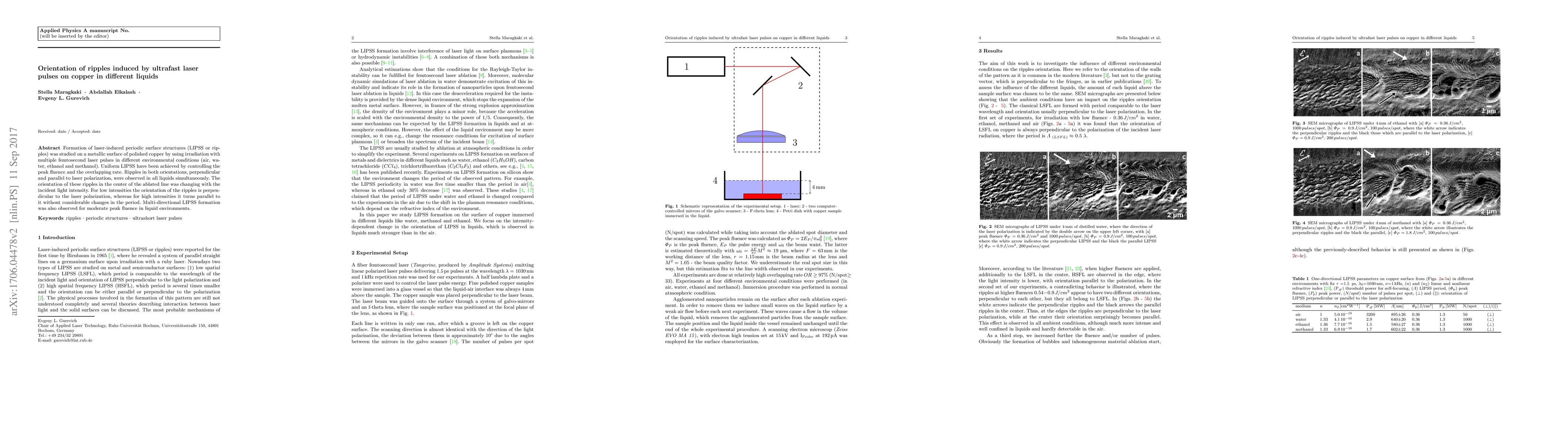This study investigates how femtosecond laser pulses create periodic surface structures (LIPSS) on copper in various liquids, finding ripples in perpendicular and parallel orientations to laser polarization, with orientation changing from perpendicular to parallel as light intensity increases. Multi-directional LIPSS formation is observed at moderate peak fluences.