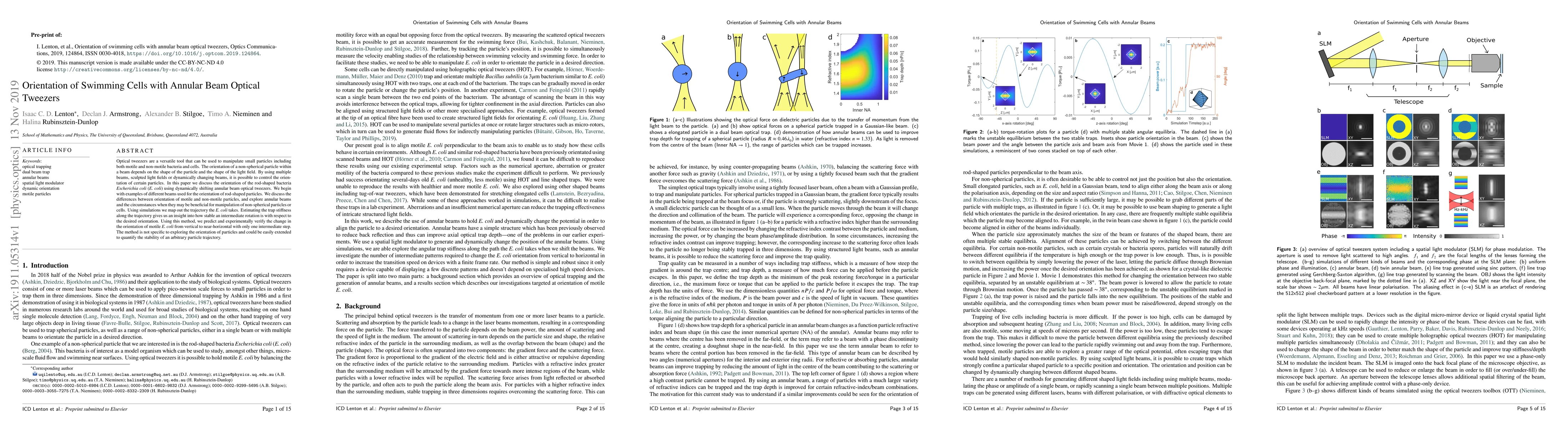This research demonstrates the use of dynamically shifting annular beam optical tweezers to orient rod-shaped E. coli bacteria, predicting and verifying their transition from vertical to near-horizontal orientation. The method, applicable to non-spherical particles, offers insights into particle stability during manipulation.