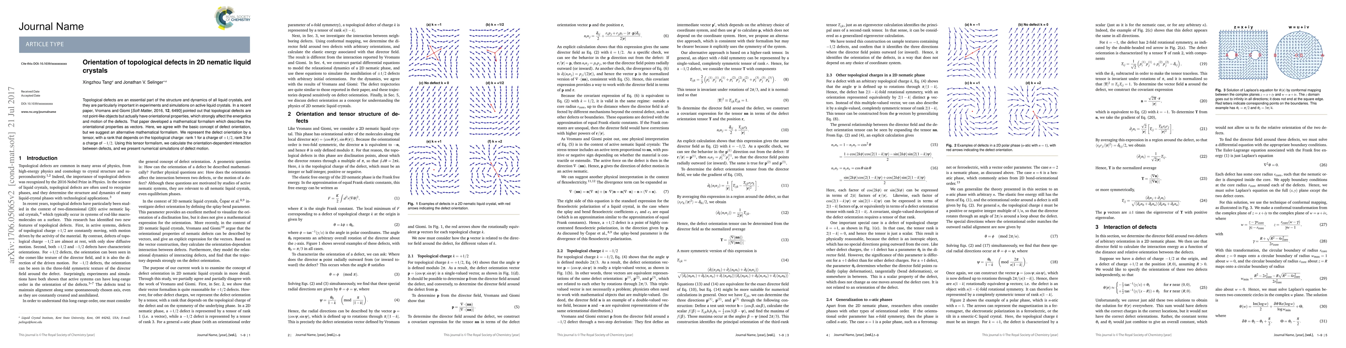 Topological defects are an essential part of the structure and dynamics of all liquid crystals, and they are particularly important in experiments and simulations on active liquid crystals. In a recent paper, Vromans and Giomi [Soft Matter, 2016, 12, 6490] pointed out that topological defects are not point-like objects but actually have orientational properties, which strongly affect the energetics and motion of the defects. That paper developed a mathematical formalism which describes the orientational properties as vectors. Here, we agree with the basic concept of defect orientation, but we suggest an alternative mathematical formalism. We represent the defect orientation by a tensor, with a rank that depends on the topological charge: rank 1 for a charge of +1/2, rank 3 for a charge of -1/2. Using this tensor formalism, we calculate the orientation-dependent interaction between defects, and we present numerical simulations of defect motion.