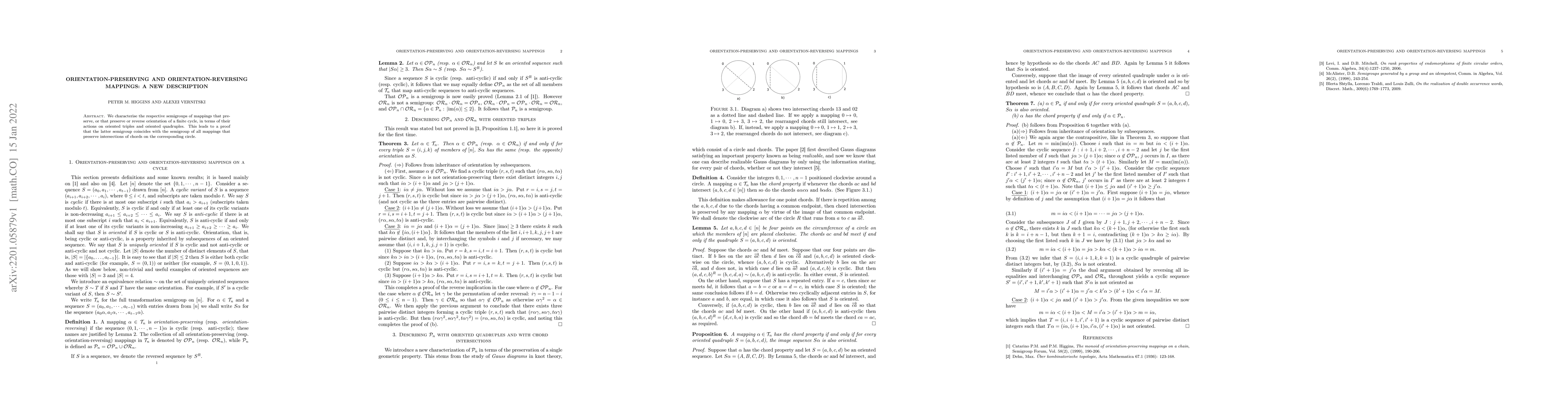 We characterise the respective semigroups of mappings that preserve, or that preserve or reverse orientation of a finite cycle, in terms of their actions on oriented triples and oriented quadruples. This leads to a proof that the latter semigroup coincides with the semigroup of all mappings that preserve intersections of chords on the corresponding circle.