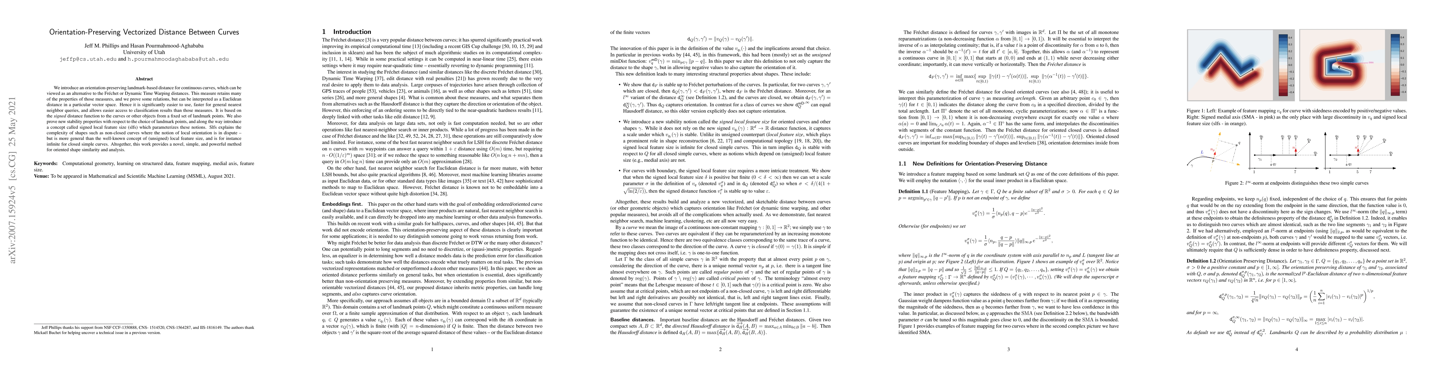 This paper presents a new orientation-preserving distance measure for continuous curves, easier to use and faster than existing methods like Frechet or Dynamic Time Warping. It's based on signed distance functions from landmark points, introducing 'signed local feature size' (slfs) for shape complexity analysis.