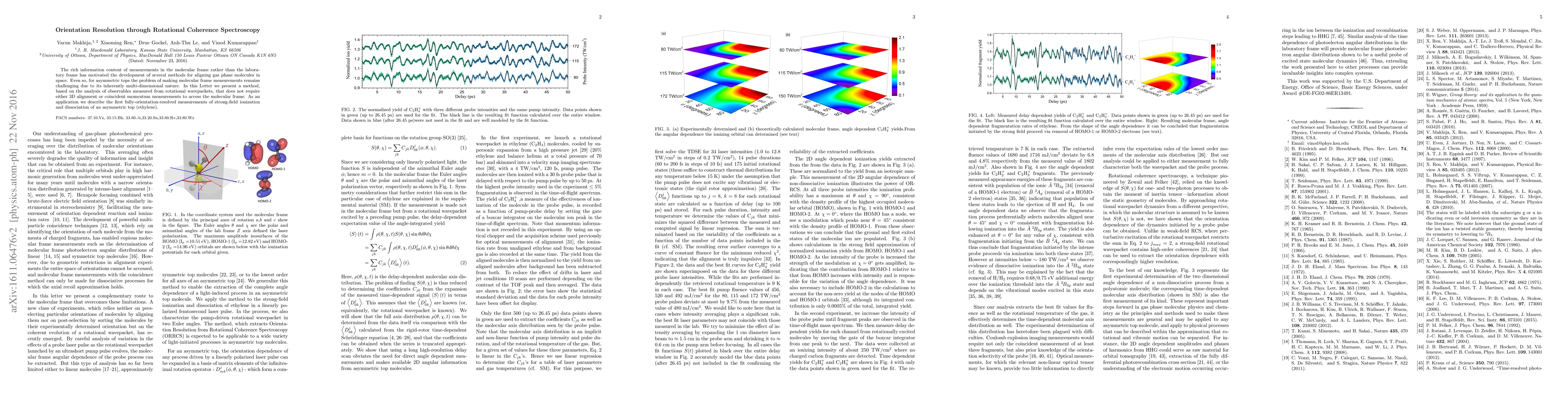 This paper introduces a novel method for orientation resolution in asymmetric top molecules using rotational coherence spectroscopy, which analyzes rotational wavepackets without requiring 3D alignment or coincident momentum measurements. The method enables fully-orientation-resolved measurements of strong-field ionization and dissociation in ethylene, demonstrating its practical application.