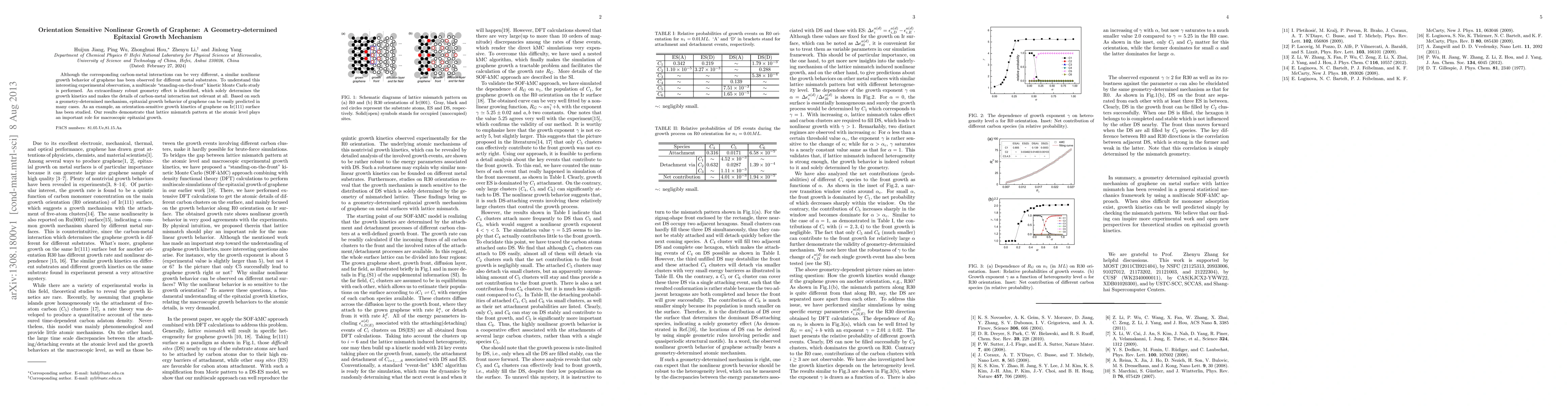 This research identifies a geometry-determined mechanism for the nonlinear growth of graphene on various metal substrates, emphasizing that atomic-level lattice mismatch patterns govern the epitaxial growth kinetics rather than carbon-metal interaction details. A standing-on-the-front kinetic Monte Carlo study highlights the robust role of substrate geometry in predicting graphene growth behavior, exemplified by the orientation-sensitive growth on Ir(111).
