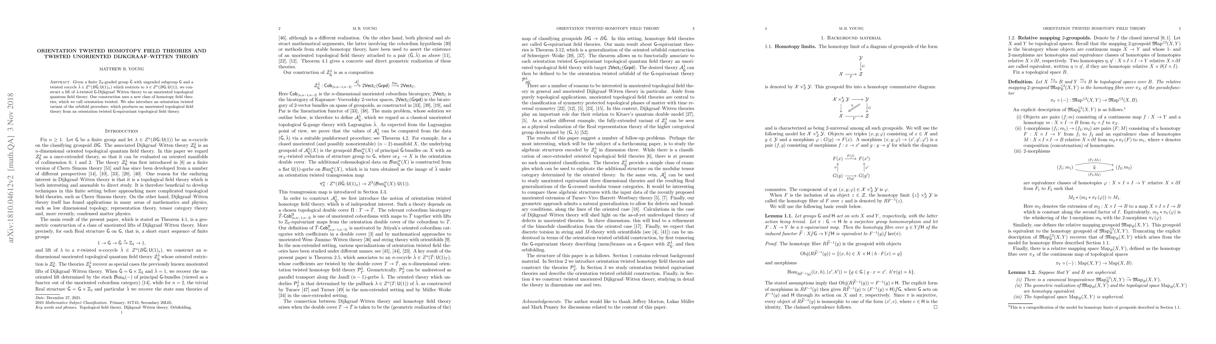 Given a finite $\mathbb{Z}_2$-graded group $\hat{\mathsf{G}}$ with ungraded subgroup $\mathsf{G}$ and a twisted cocycle $\hat{\lambda} \in Z^n(B \hat{\mathsf{G}}; \mathsf{U}(1)_{\pi})$ which restricts to $\lambda \in Z^n(B \mathsf{G}; \mathsf{U}(1))$, we construct a lift of $\lambda$-twisted $\mathsf{G}$-Dijkgraaf--Witten theory to an unoriented topological quantum field theory. Our construction uses a new class of homotopy field theories, which we call orientation twisted. We also introduce an orientation twisted variant of the orbifold procedure, which produces an unoriented topological field theory from an orientation twisted $\mathsf{G}$-equivariant topological field theory.