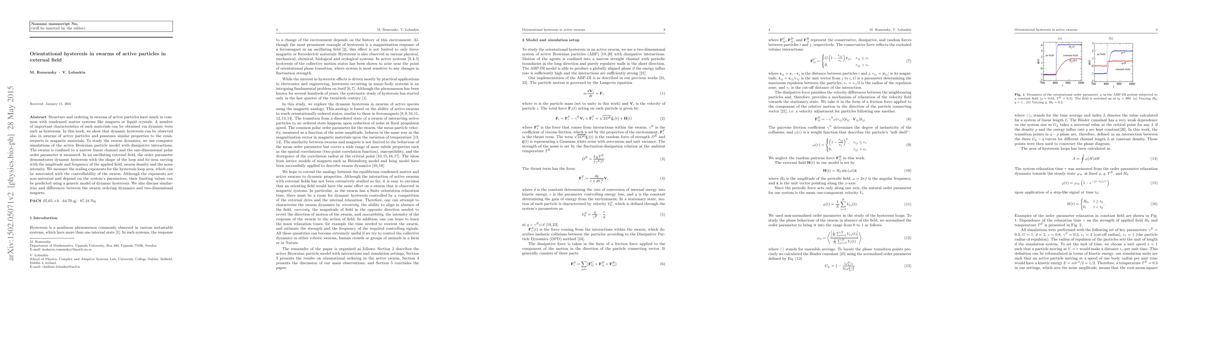 Structure and ordering in swarms of active particles have much in common with condensed matter systems like magnets or liquid crystals. A number of important characteristics of such materials can be obtained via dynamic tests such as hysteresis. In this work, we show that dynamic hysteresis can be observed also in swarms of active particles and possesses similar properties to the counterparts in magnetic materials. To study the swarm dynamics, we use computer simulations of the active Brownian particle model with dissipative interactions. The swarm is confined to a narrow linear channel and the one-dimensional polar order parameter is measured. In an oscillating external field, the order parameter demonstrates dynamic hysteresis with the shape of the loop and its area varying with the amplitude and frequency of the applied field, swarm density and the noise intensity. We measure the scaling exponents for the hysteresis loop area, which can be associated with the controllability of the swarm. Although the exponents are non-universal and depend on the system's parameters, their limiting values can be predicted using a generic model of dynamic hysteresis. We also discuss similarities and differences between the swarm ordering dynamics and two-dimensional magnets.