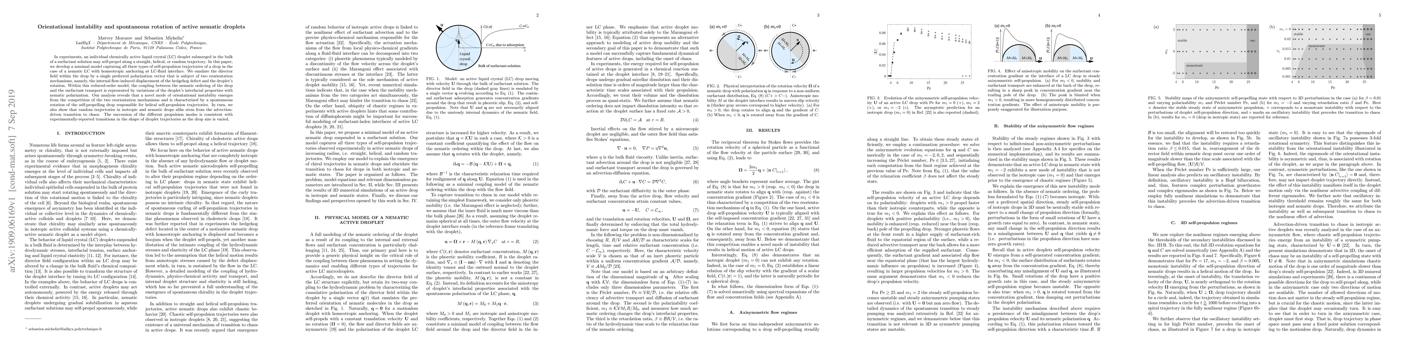 This paper develops a minimal model to describe the diverse self-propulsion trajectories of chemically active nematic liquid crystal droplets, revealing a novel orientational instability leading to spontaneous droplet rotation and helical motion. It also links random trajectories to advection-driven chaos, aligning with experimental observations of trajectory transitions with droplet size.