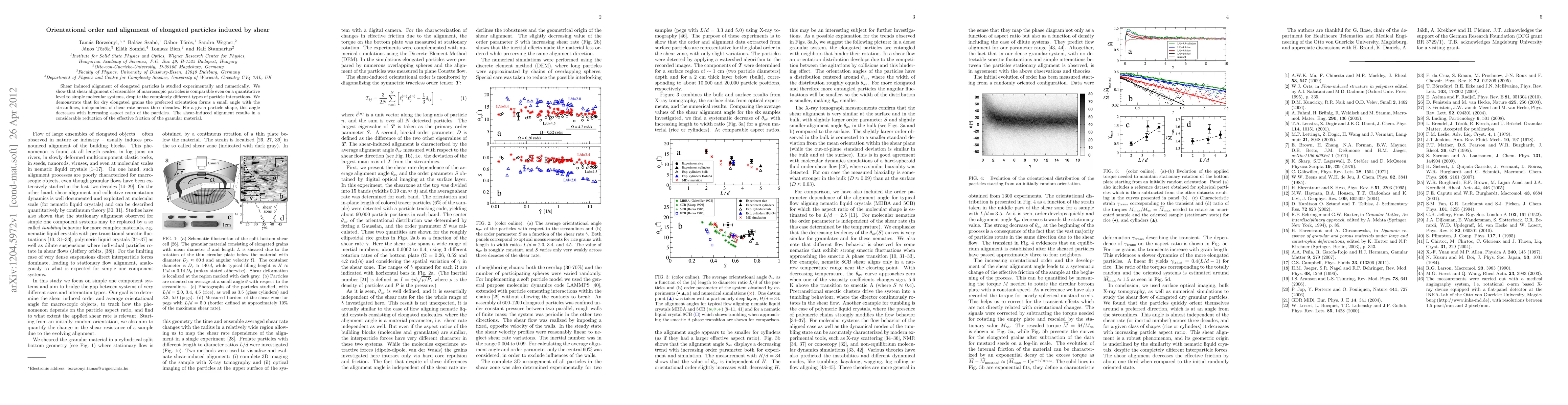 This study experimentally and numerically investigates shear-induced alignment of elongated particles, showing comparable alignment effects to molecular systems despite different interactions. The preferred orientation forms a small angle with streamlines, decreasing with higher aspect ratios, leading to reduced effective friction in granular materials.