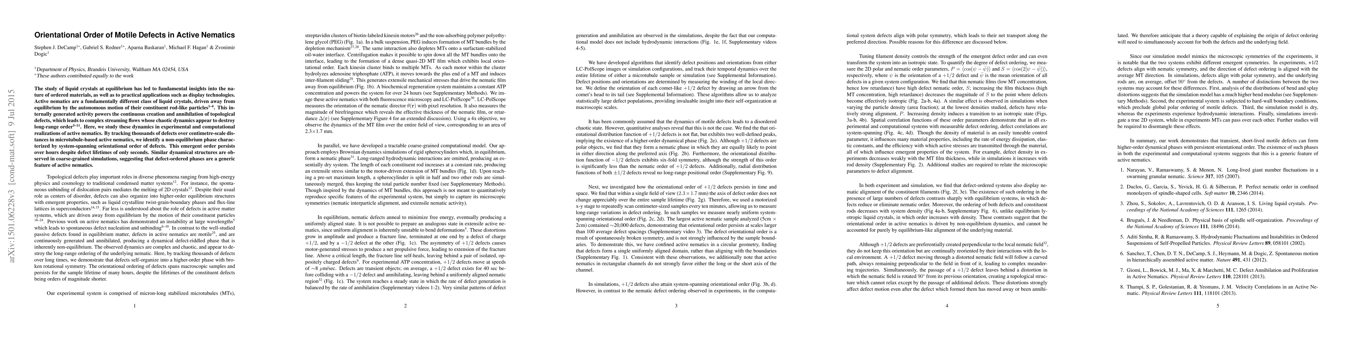 This paper investigates the dynamics of motile defects in active nematics, revealing a non-equilibrium phase with long-lasting orientational order despite rapid defect turnover. Experimental and computational studies show that these defect-ordered phases are a common feature in active nematic systems.