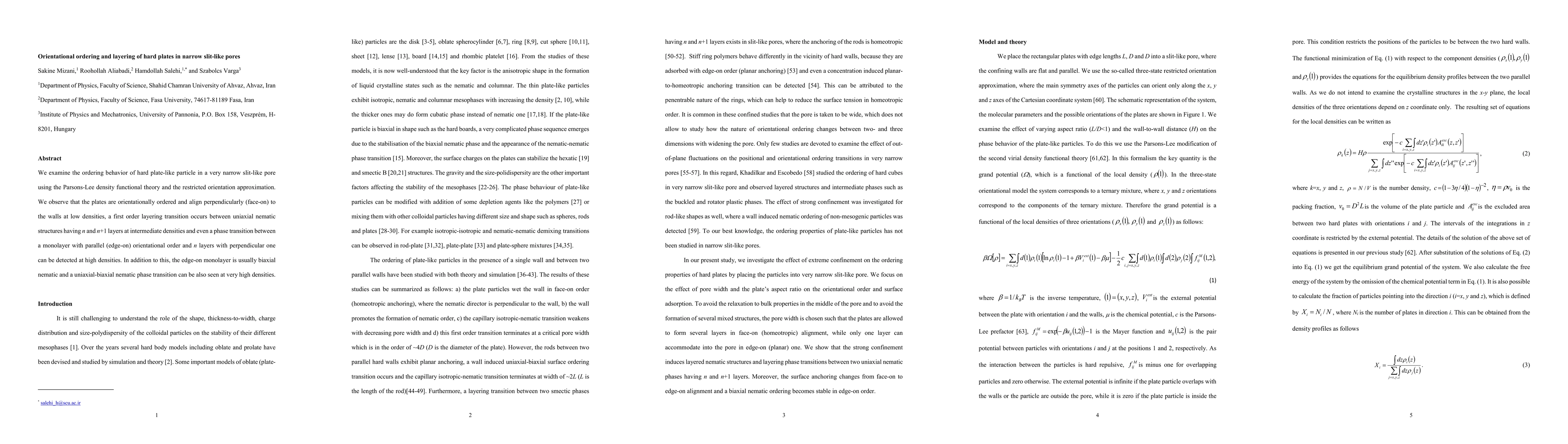This paper investigates the orientational ordering of hard plate-like particles in narrow slit-pores, revealing face-on alignment at low densities, a first-order layering transition at intermediate densities, and a phase transition to edge-on orientation at high densities, accompanied by a uniaxial-biaxial nematic transition.