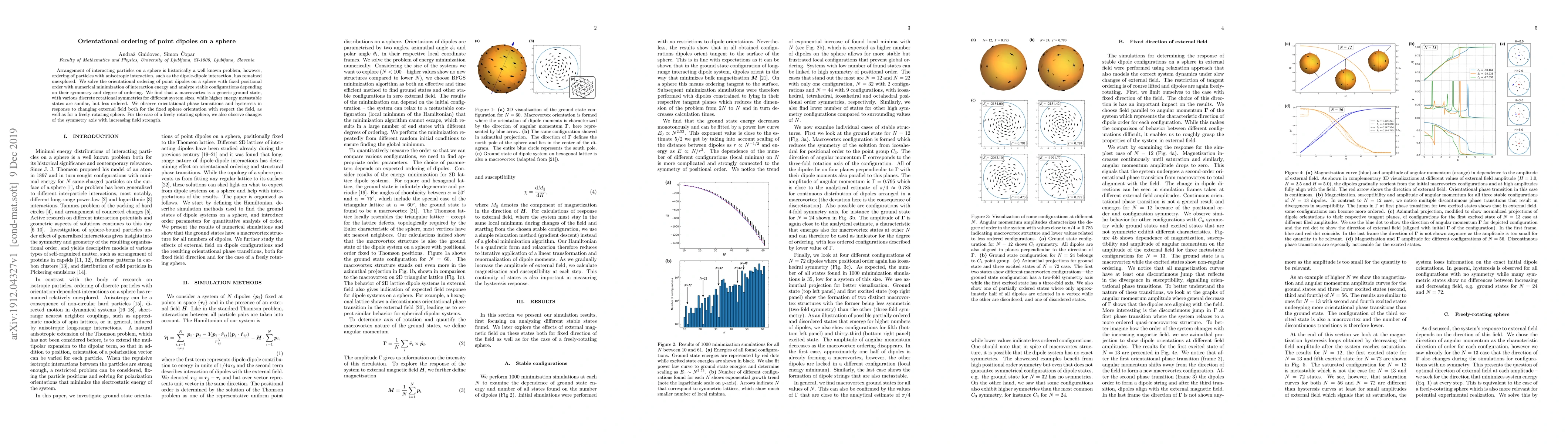 This study investigates the orientational ordering of point dipoles on a sphere with dipole-dipole interactions, revealing that a macrovortex is the common ground state. The research identifies stable configurations and observes phase transitions and hysteresis in response to external fields, with symmetry changes in freely rotating spheres.