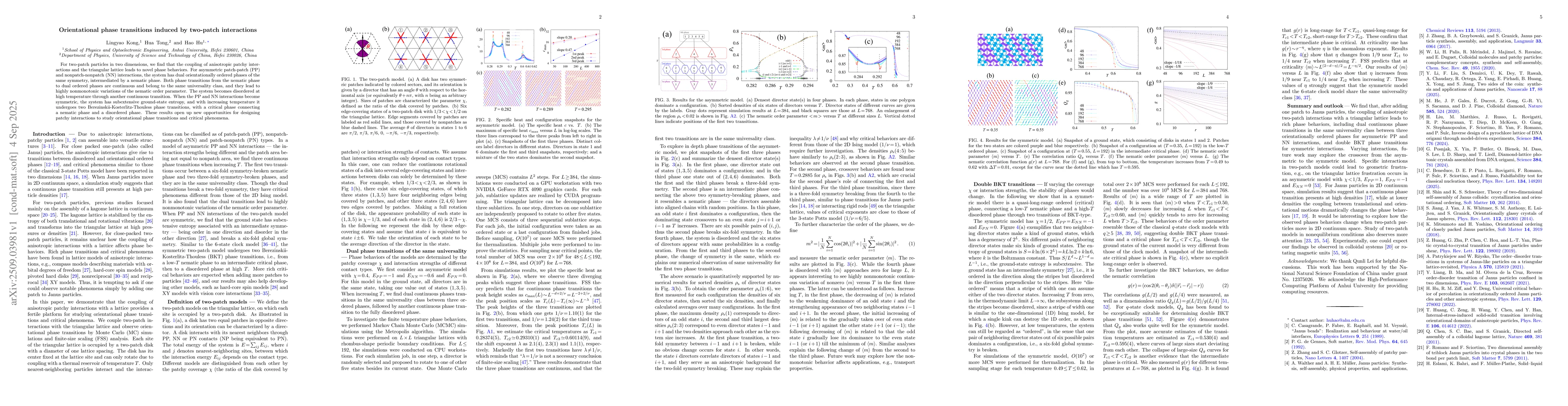 For two-patch particles in two dimensions, we find that the coupling of anisotropic patchy interactions and the triangular lattice leads to novel phase behaviors. For asymmetric patch-patch (PP) and nonpatch-nonpatch (NN) interactions, the system has dual orientationally ordered phases of the same symmetry, intermediated by a nematic phase. Both phase transitions from the nematic phase to dual ordered phases are continuous and belong to the same universality class, and they lead to highly nonmonotonic variations of the nematic order parameter. The system becomes disordered at high temperature through another continuous transition. When the PP and NN interactions become symmetric, the system has subextensive ground-state entropy, and with increasing temperature it undergoes two Berezinskii-Kosterlitz-Thouless phase transitions, with a critical phase connecting a nematic phase and a disordered phase. These results open up new opportunities for designing patchy interactions to study orientational phase transitions and critical phenomena.