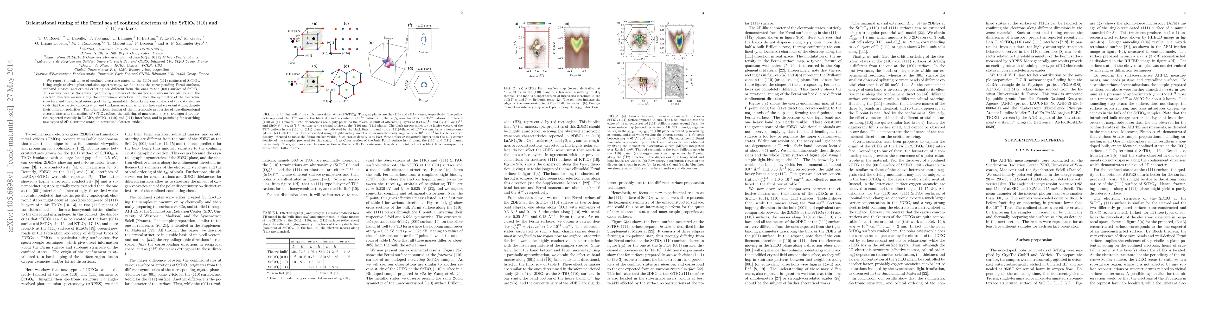 This paper reports on the distinct Fermi surface properties of confined electrons at the SrTiO3 (110) and (111) surfaces compared to the (001) surface, revealing orientational tuning influenced by surface symmetries and electron confinement. The study highlights the potential for tailoring macroscopic properties in correlated-electron oxides.