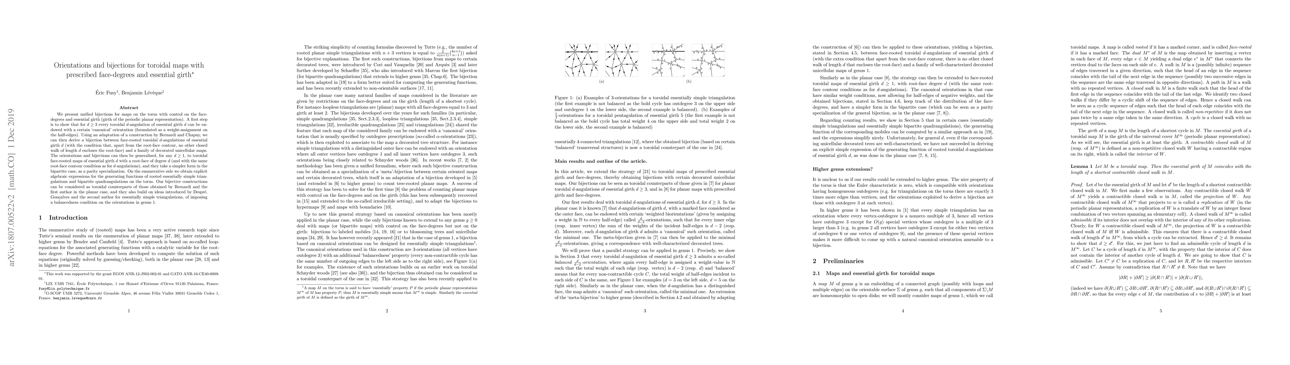 This paper presents unified bijections for toroidal maps with controlled face-degrees and essential girth, establishing a "canonical" orientation for toroidal d-angulations and deriving bijections between these and decorated unicellular maps. The constructions generalize to any d and yield explicit algebraic expressions for generating functions of rooted triangulations and quadrangulations on the torus.