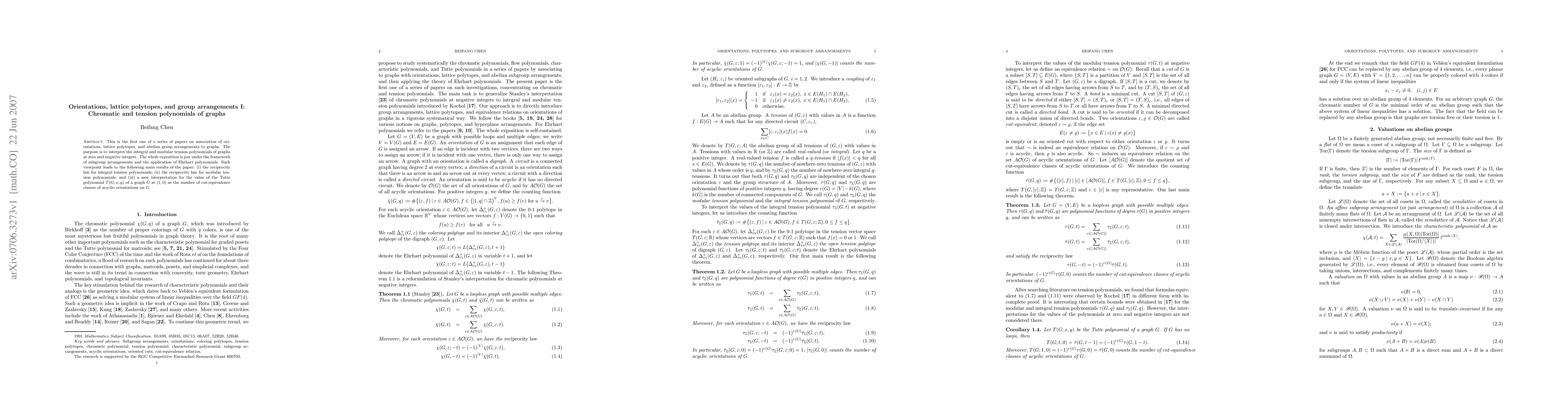 This is the first one of a series of papers on association of orientations, lattice polytopes, and abelian group arrangements to graphs. The purpose is to interpret the integral and modular tension polynomials of graphs at zero and negative integers. The whole exposition is put under the framework of subgroup arrangements and the application of Ehrhart polynomials. Such viewpoint leads to the following main results of the paper: (i) the reciprocity law for integral tension polynomials; (ii) the reciprocity law for modular tension polynomials; and (iii) a new interpretation for the value of the Tutte polynomial $T(G;x,y)$ of a graph $G$ at $(1,0)$ as the number of cut-equivalence classes of acyclic orientations on $G$.
