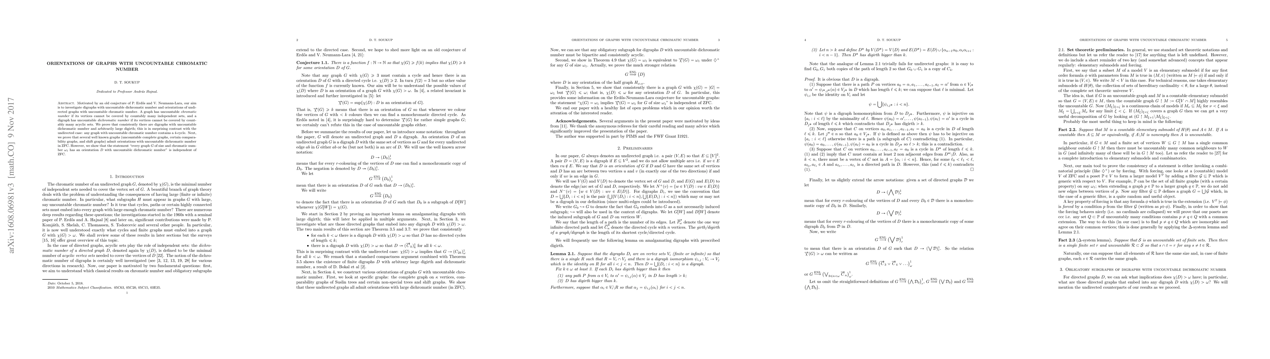 Motivated by an old conjecture of P. Erd\H{o}s and V. Neumann-Lara, our aim is to investigate digraphs with uncountable dichromatic number and orientations of undirected graphs with uncountable chromatic number. A graph has uncountable chromatic number if its vertices cannot be covered by countably many independent sets, and a digraph has uncountable dichromatic number if its vertices cannot be covered by countably many acyclic sets. We prove that consistently there are digraphs with uncountable dichromatic number and arbitrarily large digirth; this is in surprising contrast with the undirected case: any graph with uncountable chromatic number contains a 4-cycle. Next, we prove that several well known graphs (uncountable complete graphs, certain comparability graphs, and shift graphs) admit orientations with uncountable dichromatic number in ZFC. However, we show that the statement "every graph $G$ of size and chromatic number $\omega_1$ has an orientation $D$ with uncountable dichromatic number" is independent of ZFC.