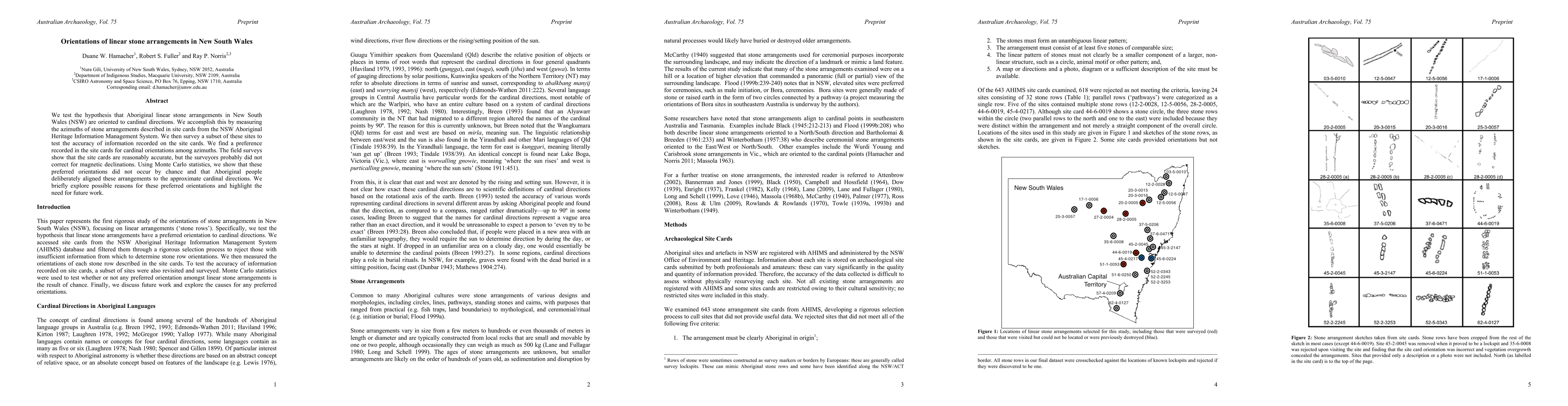 We test the hypothesis that Aboriginal linear stone arrangements in New South Wales (NSW) are oriented to cardinal directions. We accomplish this by measuring the azimuths of stone arrangements described in site cards from the NSW Aboriginal Heritage Information Management System. We then survey a subset of these sites to test the accuracy of information recorded on the site cards. We find a preference recorded in the site cards for cardinal orientations among azimuths. The field surveys show that the site cards are reasonably accurate, but the surveyors probably did not correct for magnetic declinations. Using Monte Carlo statistics, we show that these preferred orientations did not occur by chance and that Aboriginal people deliberately aligned these arrangements to the approximate cardinal directions. We briefly explore possible reasons for these preferred orientations and highlight the need for future work.