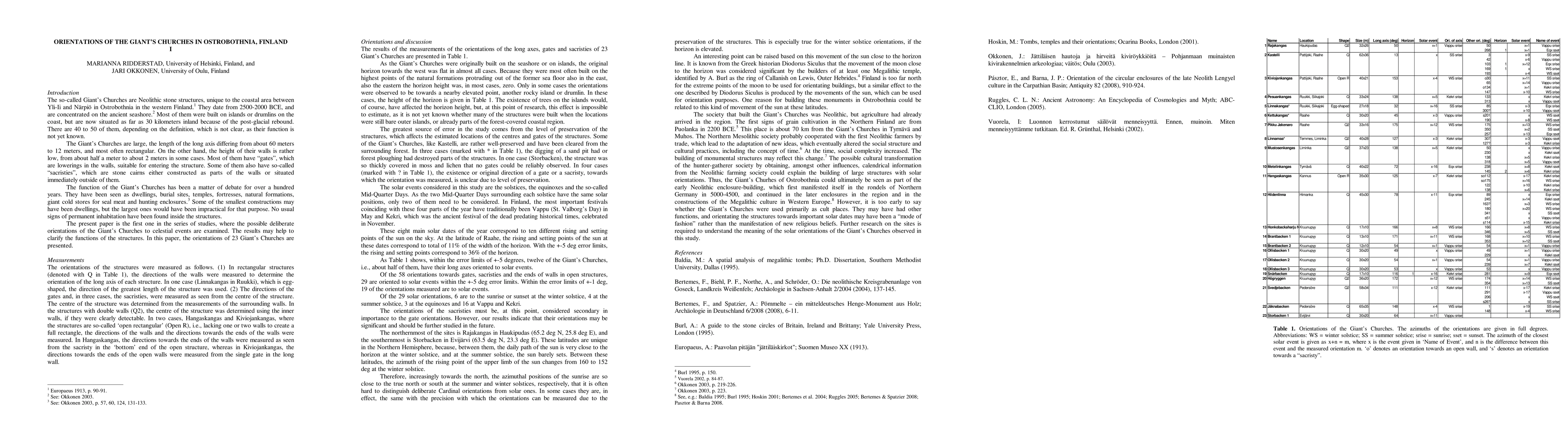 The orientations of 23 Giant's Churches, dating from 2500-2000 BCE, located in Ostrobothnia, Finland, have been measured. Many of them are found to have orientations to the risings and settings of the sun on the main solar dates of the year.