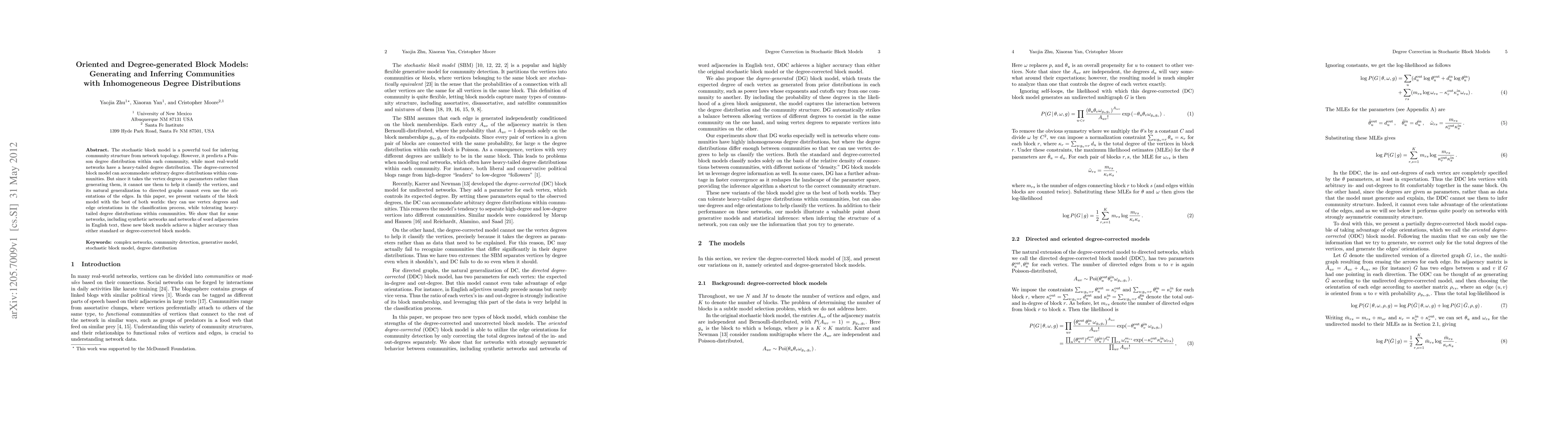 This paper introduces new variants of the block model that incorporate both vertex degrees and edge orientations, addressing the limitations of existing models that handle either degrees or orientations but not both. These new models achieve higher accuracy in community detection for networks with heavy-tailed degree distributions.