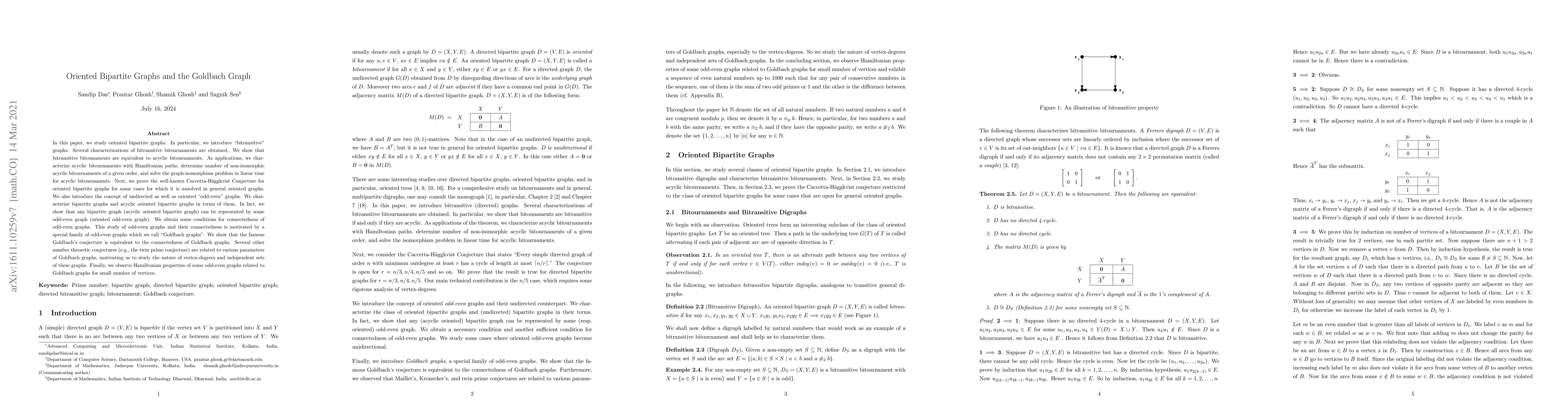 In this paper, we study oriented bipartite graphs. In particular, we introduce "bitransitive" graphs. Several characterizations of bitransitive bitournaments are obtained. We show that bitransitive bitounaments are equivalent to acyclic bitournaments. As applications, we characterize acyclic bitournaments with Hamiltonian paths, determine number of non-isomorphic acyclic bitournaments of a given order, and solve the graph-isomorphism problem in linear time for acyclic bitournaments. Next, we prove the well-known Caccetta-H$\ddot{\textrm{a}}$ggkvist Conjecture for oriented bipartite graphs for some cases for which it is unsolved in general oriented graphs. We also introduce the concept of undirected as well as oriented "odd-even" graphs. We characterize bipartite graphs and acyclic oriented bipartite graphs in terms of them. In fact, we show that any bipartite graph (acyclic oriented bipartite graph) can be represented by some odd-even graph (oriented odd-even graph). We obtain some conditions for connectedness of odd-even graphs. This study of odd-even graphs and their connectedness is motivated by a special family of odd-even graphs which we call "Goldbach graphs". We show that the famous Goldbach's conjecture is equivalent to the connectedness of Goldbach graphs. Several other number theoretic conjectures (e.g., the twin prime conjecture) are related to various parameters of Goldbach graphs, motivating us to study the nature of vertex-degrees and independent sets of these graphs. Finally, we observe Hamiltonian properties of some odd-even graphs related to Goldbach graphs for small number of vertices.
