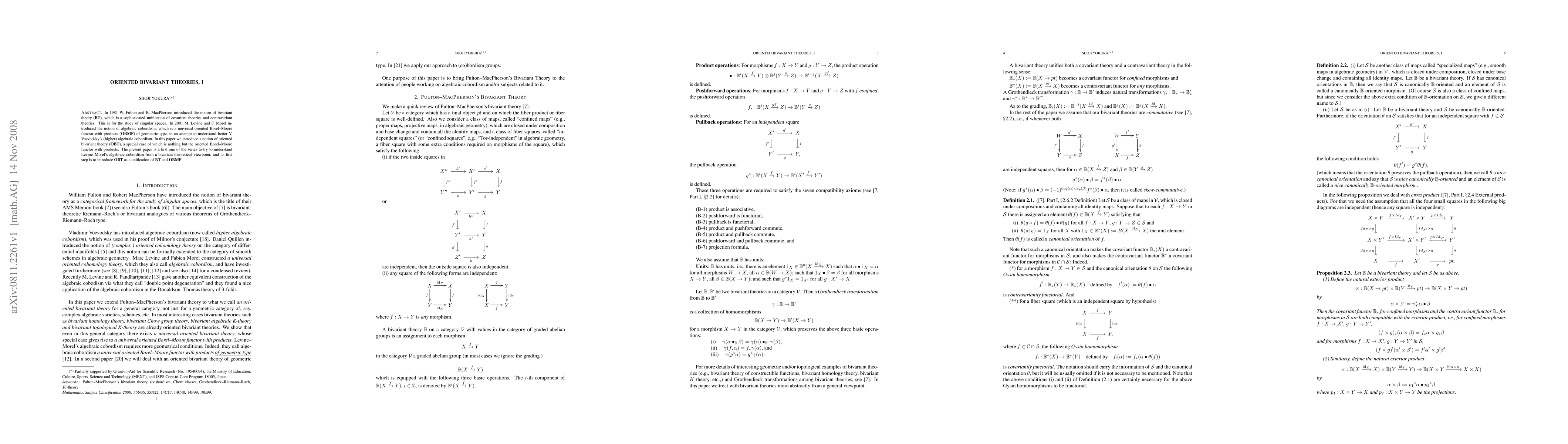 In 1981 W. Fulton and R. MacPherson introduced the notion of bivariant theory (BT), which is a sophisticated unification of covariant theories and contravariant theories. This is for the study of singular spaces. In 2001 M. Levine and F. Morel introduced the notion of algebraic cobordism, which is a universal oriented Borel-Moore functor with products (OBMF) of geometric type, in an attempt to understand better V. Voevodsky's (higher) algebraic cobordism. In this paper we introduce a notion of oriented bivariant theory (OBT), a special case of which is nothing but the oriented Borel-Moore functor with products. The present paper is a first one of the series to try to understand Levine-Morel's algebraic cobordism from a bivariant-theoretical viewpoint, and its first step is to introduce OBT as a unification of BT and OBMF.