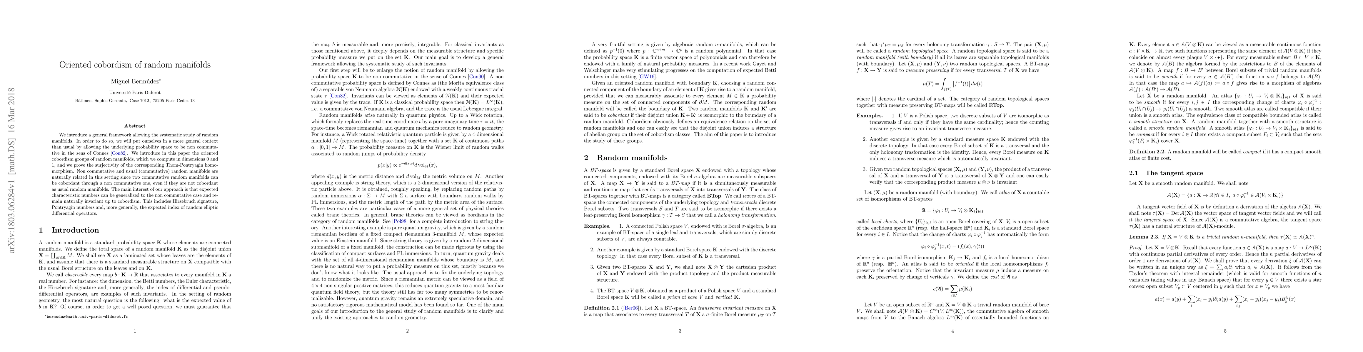 We introduce a general framework allowing the systematic study of random manifolds. In order to do so, we will put ourselves in a more general context than usual by allowing the underlying probability space to be non commutative. We introduce in this paper the oriented cobordism groups of random manifolds, which we compute in dimensions 0 and 1, and we prove the surjectivity of the corresponding Thom-Pontryagin homomorphism. Non commutative and usual (commutative) random manifolds are naturally related in this setting since two commutative random manifolds can be cobordant through a non commutative one, even if they are not cobordant as usual random manifolds. The main interest of our approach is that expected characteristic numbers can be generalized to the non commutative case and remain naturally invariant up to cobordism. This includes Hirzebruch signature, Pontryagin numbers and, more generally, the expected index of random elliptic differential operators