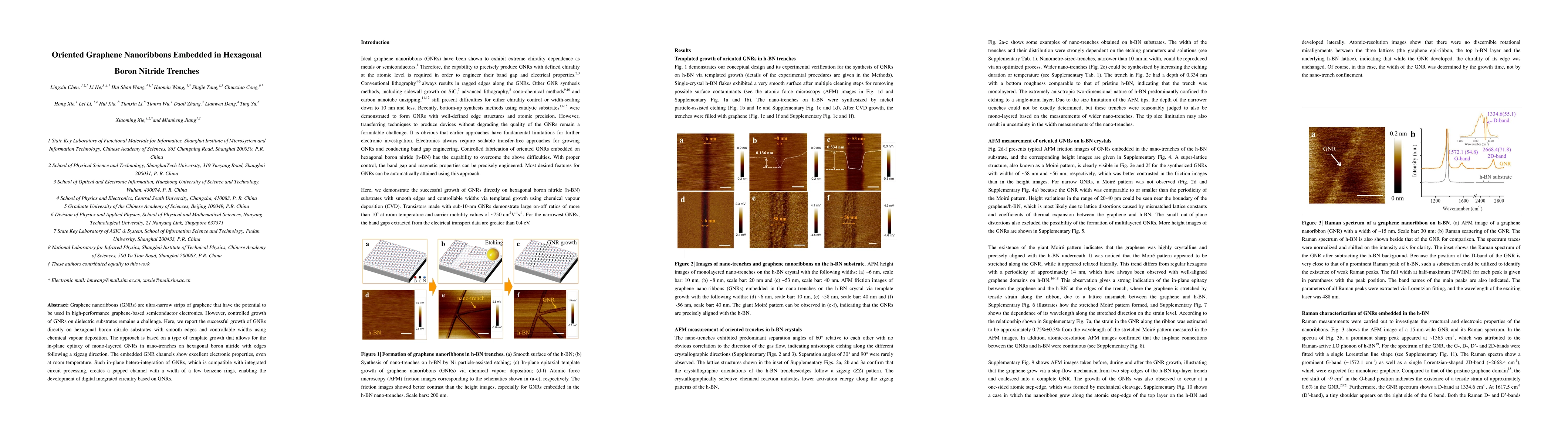 This study reports the successful growth of oriented graphene nanoribbons (GNRs) embedded in hexagonal boron nitride trenches using chemical vapour deposition, achieving smooth edges and controllable widths. The in-plane hetero-integration of GNRs exhibits excellent electronic properties, paving the way for GNR-based digital integrated circuits.