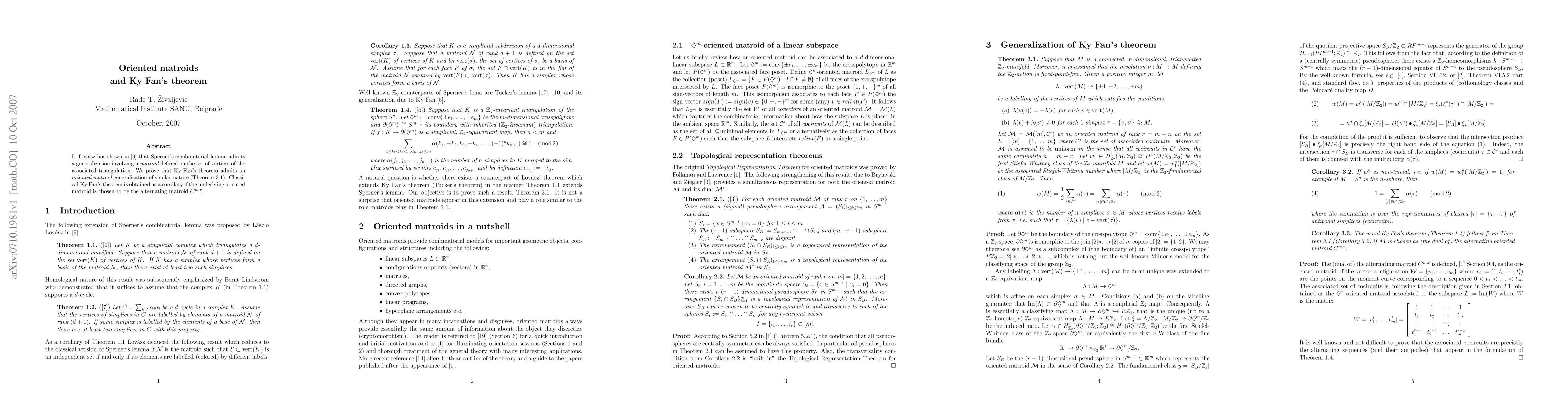 This paper generalizes Ky Fan's theorem using oriented matroids, showing that it can be derived from the alternating matroid C^{m,r}. The work is inspired by the generalization of Sperner's lemma to matroids.