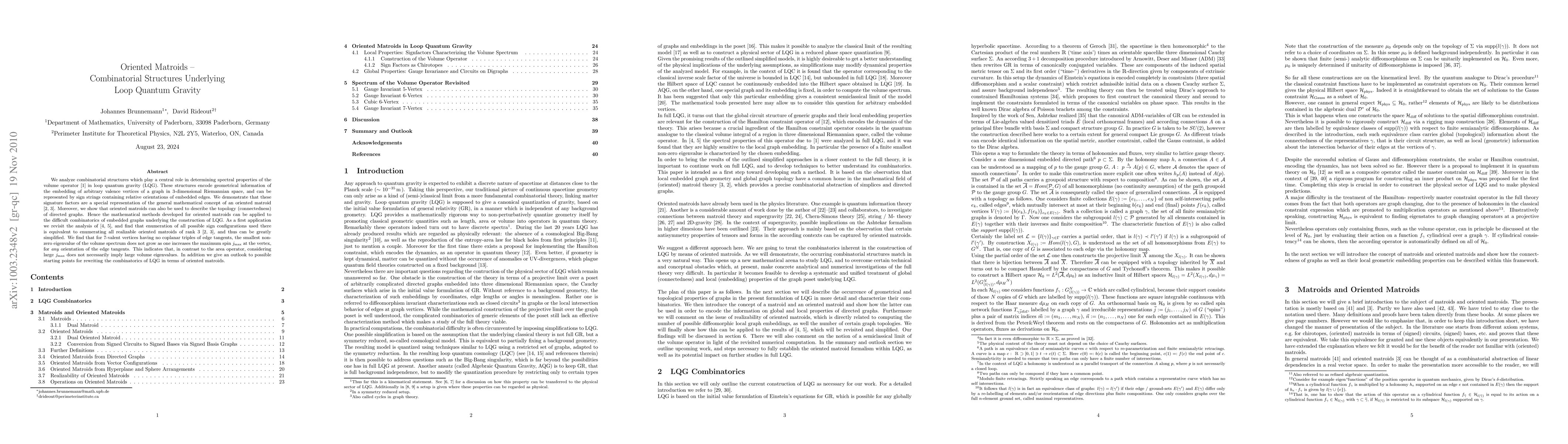 We analyze combinatorial structures which play a central role in determining spectral properties of the volume operator in loop quantum gravity (LQG). These structures encode geometrical information of the embedding of arbitrary valence vertices of a graph in 3-dimensional Riemannian space, and can be represented by sign strings containing relative orientations of embedded edges. We demonstrate that these signature factors are a special representation of the general mathematical concept of an oriented matroid. Moreover, we show that oriented matroids can also be used to describe the topology (connectedness) of directed graphs. Hence the mathematical methods developed for oriented matroids can be applied to the difficult combinatorics of embedded graphs underlying the construction of LQG. As a first application we revisit the analysis of [4-5], and find that enumeration of all possible sign configurations used there is equivalent to enumerating all realizable oriented matroids of rank 3, and thus can be greatly simplified. We find that for 7-valent vertices having no coplanar triples of edge tangents, the smallest non-zero eigenvalue of the volume spectrum does not grow as one increases the maximum spin $\jmax$ at the vertex, for any orientation of the edge tangents. This indicates that, in contrast to the area operator, considering large $\jmax$ does not necessarily imply large volume eigenvalues. In addition we give an outlook to possible starting points for rewriting the combinatorics of LQG in terms of oriented matroids.