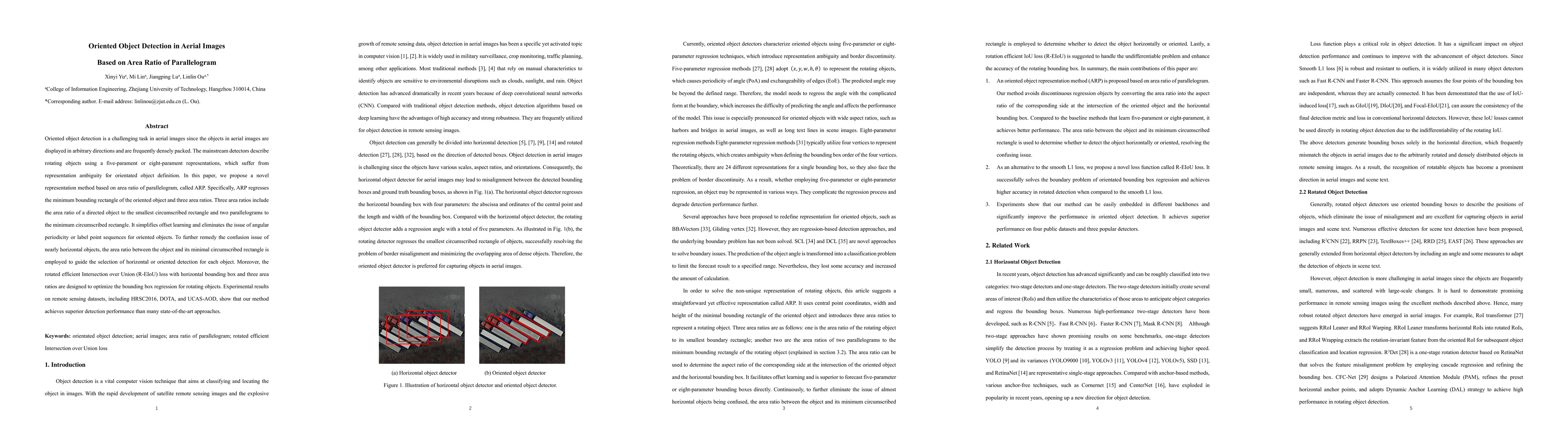 This paper proposes a novel oriented object detection method for aerial images using a parallelogram area ratio (ARP) representation, which simplifies bounding box regression and eliminates angular periodicity issues. The method achieves superior detection performance compared to state-of-the-art approaches on remote sensing datasets.