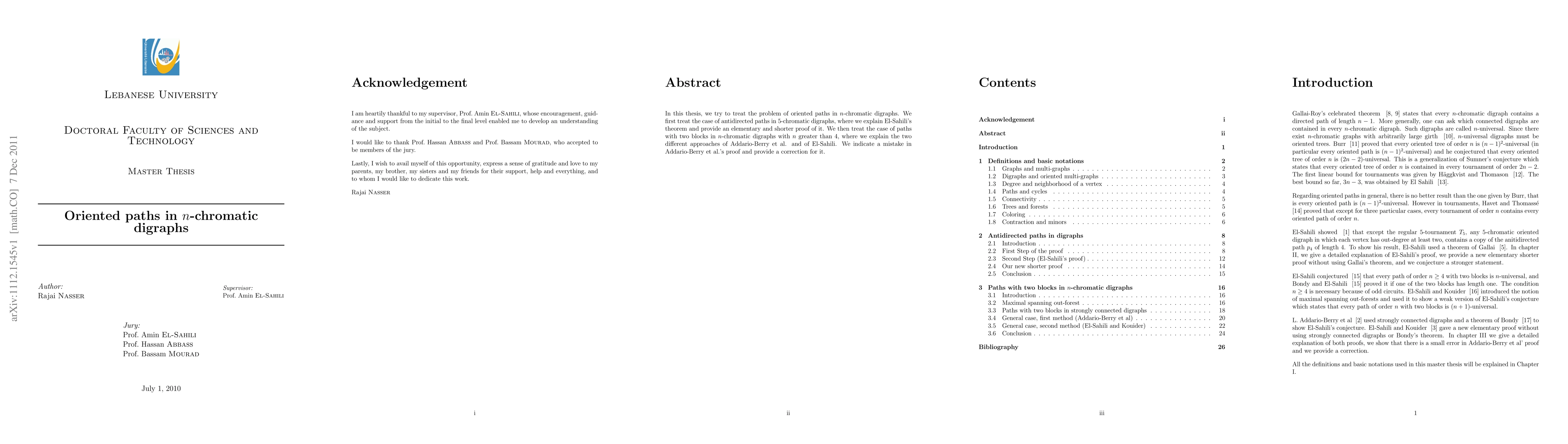 In this thesis, we try to treat the problem of oriented paths in n-chromatic digraphs. We first treat the case of antidirected paths in 5-chromatic digraphs, where we explain El-Sahili's theorem and provide an elementary and shorter proof of it. We then treat the case of paths with two blocks in n-chromatic digraphs with n greater than 4, where we explain the two different approaches of Addario-Berry et al. and of El-Sahili. We indicate a mistake in Addario-Berry et al.'s proof and provide a correction for it.
