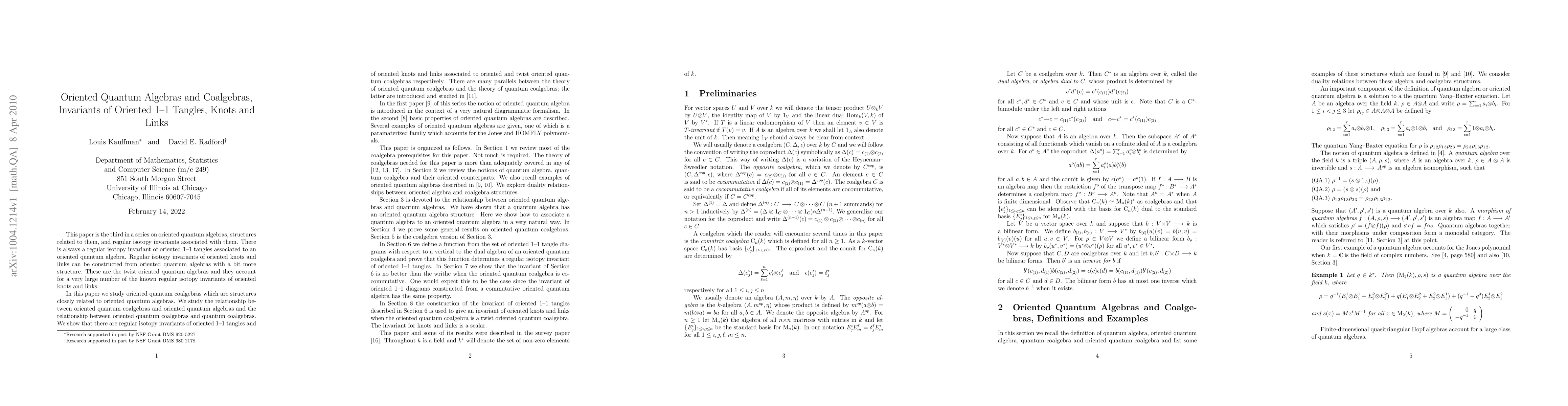 In this paper we study oriented quantum coalgebras which are structures closely related to oriented quantum algebras. We study the relationship between oriented quantum coalgebras and oriented quantum algebras and the relationship between oriented quantum coalgebras and quantum coalgebras. We show that there are regular isotopy invariants of oriented 1-1 tangles and of oriented knots and links associated to oriented and twist oriented quantum coalgebras respectively. There are many parallels between the theory of oriented quantum coalgebras and the theory of quantum coalgebras