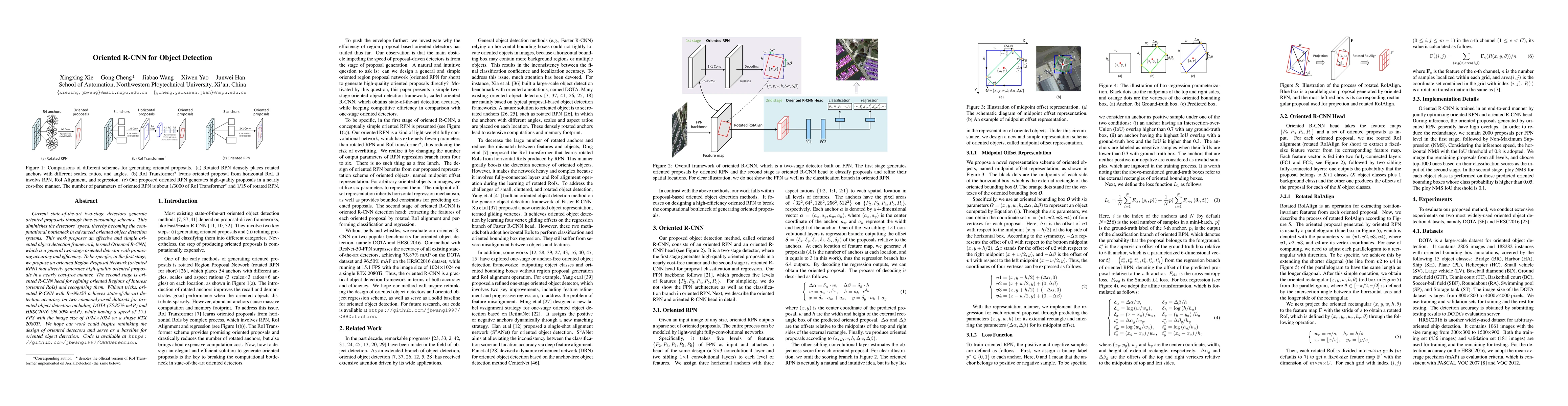 Current state-of-the-art two-stage detectors generate oriented proposals through time-consuming schemes. This diminishes the detectors' speed, thereby becoming the computational bottleneck in advanced oriented object detection systems. This work proposes an effective and simple oriented object detection framework, termed Oriented R-CNN, which is a general two-stage oriented detector with promising accuracy and efficiency. To be specific, in the first stage, we propose an oriented Region Proposal Network (oriented RPN) that directly generates high-quality oriented proposals in a nearly cost-free manner. The second stage is oriented R-CNN head for refining oriented Regions of Interest (oriented RoIs) and recognizing them. Without tricks, oriented R-CNN with ResNet50 achieves state-of-the-art detection accuracy on two commonly-used datasets for oriented object detection including DOTA (75.87% mAP) and HRSC2016 (96.50% mAP), while having a speed of 15.1 FPS with the image size of 1024$\times$1024 on a single RTX 2080Ti. We hope our work could inspire rethinking the design of oriented detectors and serve as a baseline for oriented object detection. Code is available at https://github.com/jbwang1997/OBBDetection.