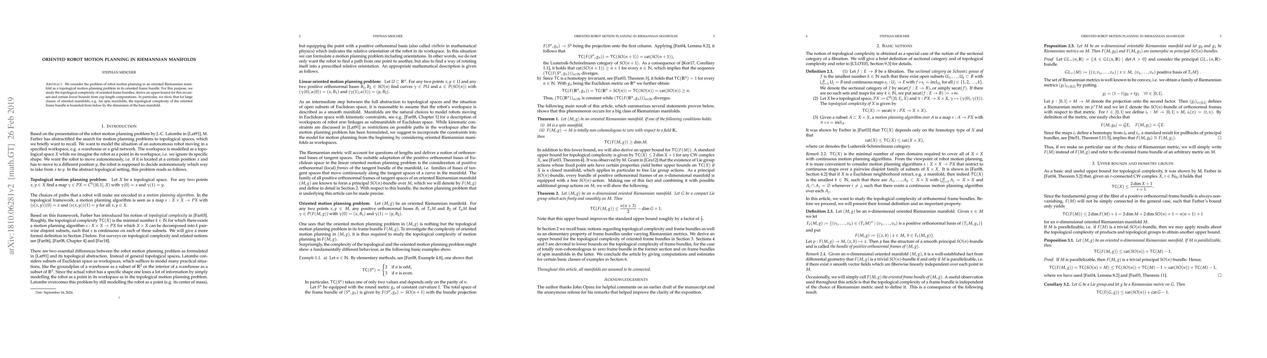 This paper addresses robot motion planning in oriented Riemannian manifolds by framing it as a topological problem in the oriented frame bundle. It derives upper and lower bounds for the topological complexity of these bundles, showing that for large classes of manifolds, such as spin manifolds, the complexity is at least as large as the base manifold's dimension.