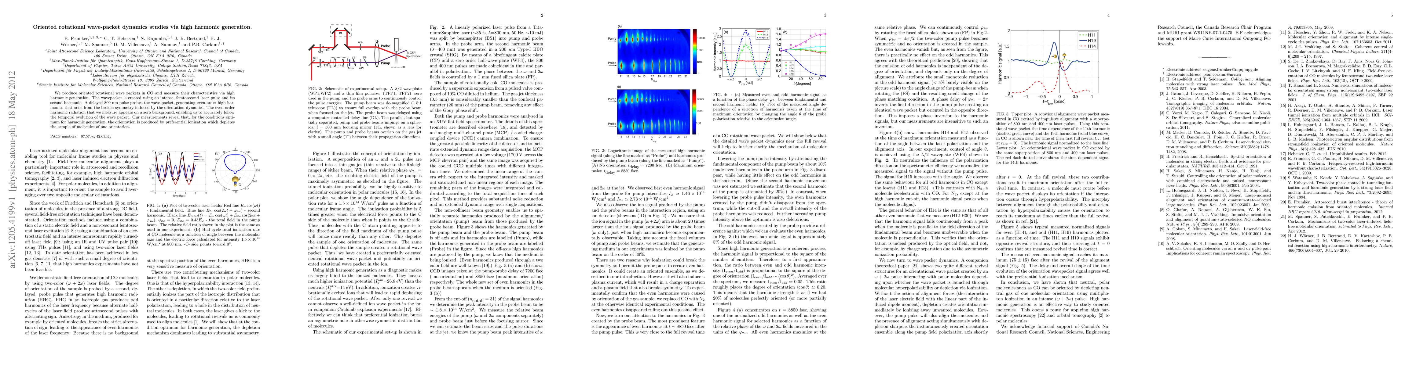 We produce oriented rotational wave packets in CO and measure their characteristics via high harmonic generation. The wavepacket is created using an intense, femtosecond laser pulse and its second harmonic. A delayed 800 nm pulse probes the wave packet, generating even-order high harmonics that arise from the broken symmetry induced by the orientation dynamics. The even-order harmonic radiation that we measure appears on a zero background, enabling us to accurately follow the temporal evolution of the wave packet. Our measurements reveal that, for the conditions optimum for harmonic generation, the orientation is produced by preferential ionization which depletes the sample of molecules of one orientation.