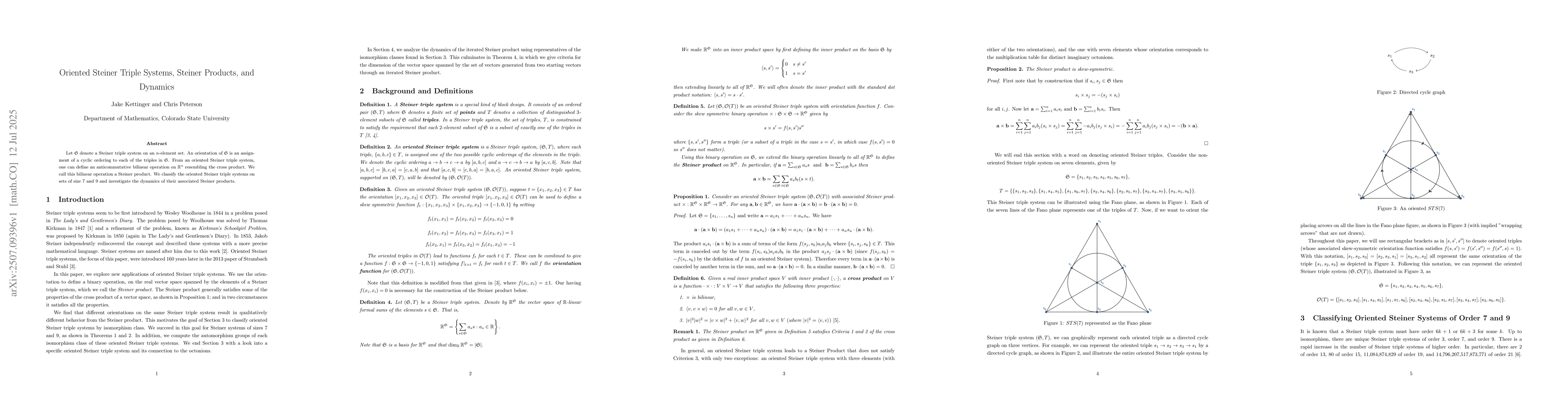 Let S denote a Steiner triple system on an n-element set. An orientation of S is an assignment of a cyclic ordering to each of the triples in S. From an oriented Steiner triple system, one can define an anticommutative bilinear operation on Rn resembling the cross product. We call this bilinear operation a Steiner product. We classify the oriented Steiner triple systems on sets of size 7 and 9 and investigate the dynamics of their associated Steiner products.