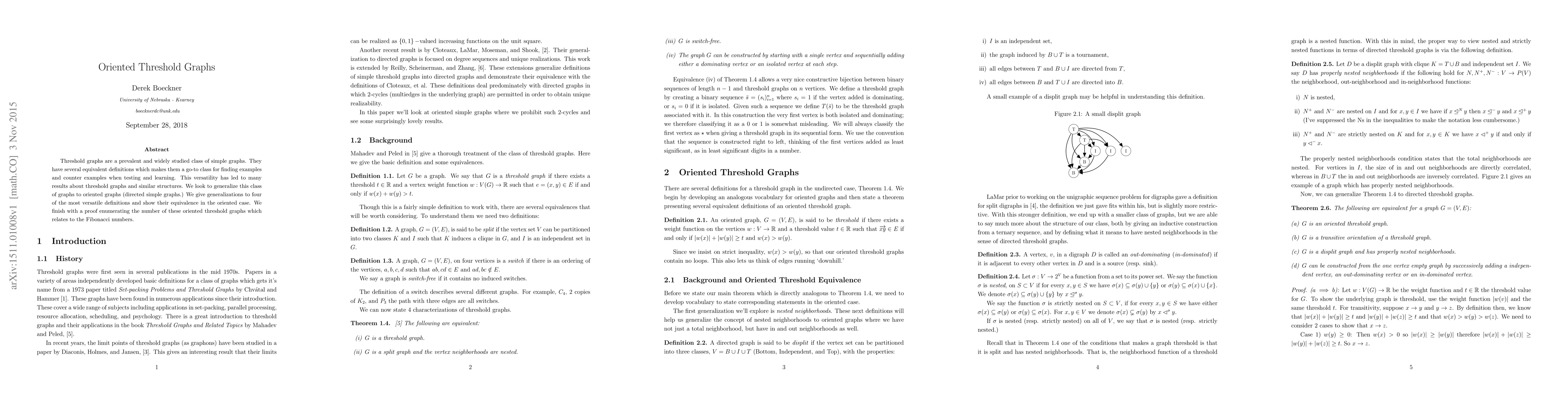 This paper generalizes the concept of threshold graphs to oriented graphs, providing four equivalent definitions and proving their equivalence in the directed context. It concludes with an enumeration of these oriented threshold graphs linked to Fibonacci numbers.