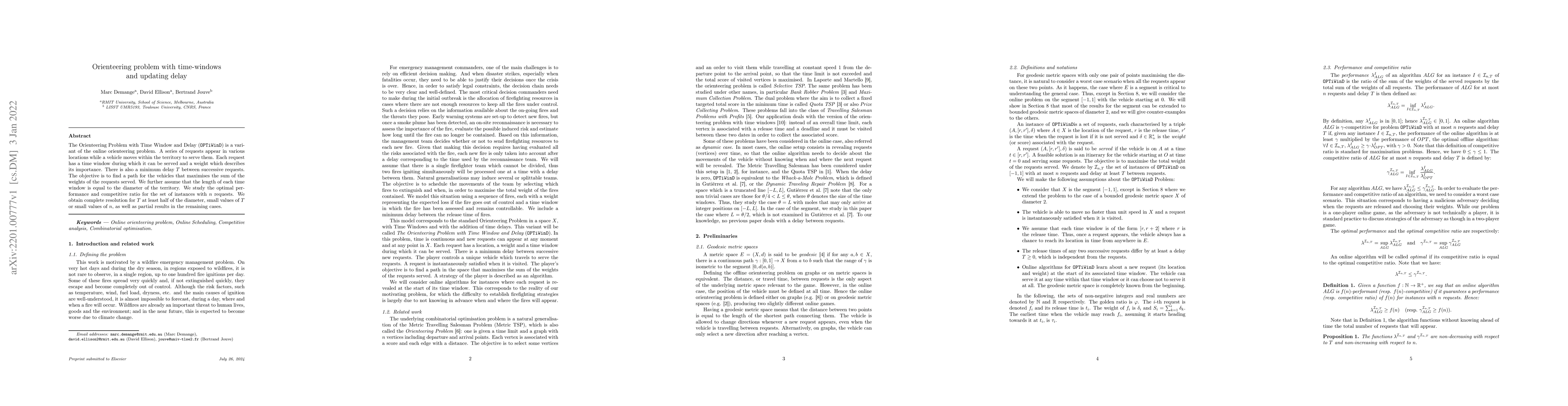 The Orienteering Problem with Time Window and Delay (\OPTiWinD) is a variant of the online orienteering problem. A series of requests appear in various locations while a vehicle moves within the territory to serve them. Each request has a time window during which it can be served and a weight which describes its importance. There is also a minimum delay $T$ between successive requests. The objective is to find a path for the vehicles that maximises the sum of the weights of the requests served. We further assume that the length of each time window is equal to the diameter of the territory. We study the optimal performance and competitive ratio for the set of instances with $n$ requests. We obtain complete resolution for $T$ at least half of the diameter, small values of $T$ or small values of $n$, as well as partial results in the remaining cases.