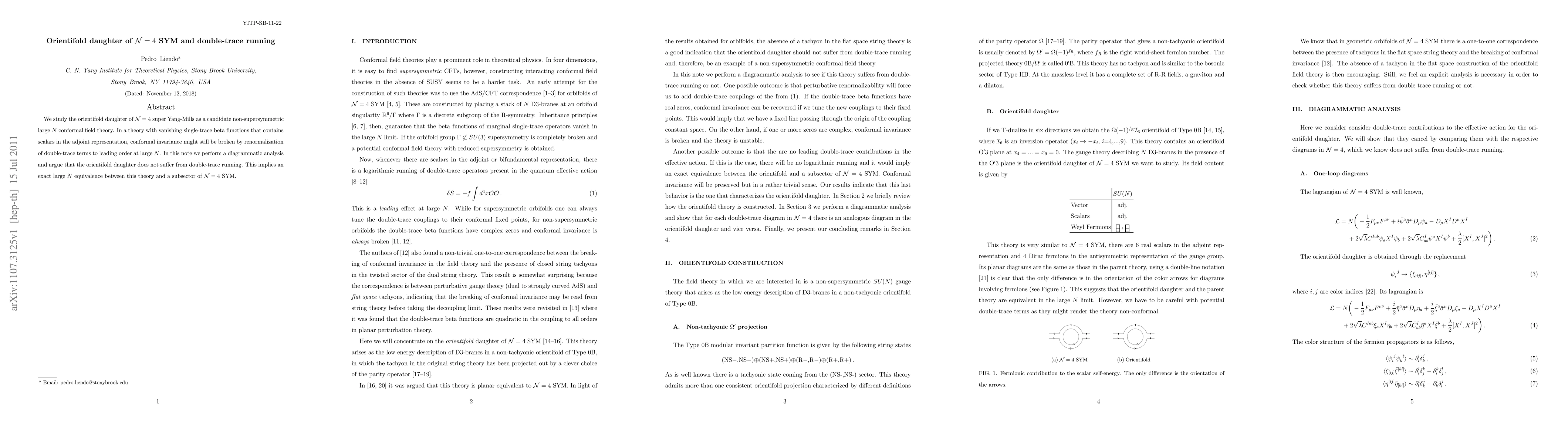 We study the orientifold daughter of N=4 super Yang-Mills as a candidate non-supersymmetric large N conformal field theory. In a theory with vanishing single-trace beta functions that contains scalars in the adjoint representation, conformal invariance might still be broken by renormalization of double-trace terms to leading order at large N. In this note we perform a diagrammatic analysis and argue that the orientifold daughter does not suffer from double-trace running. This implies an exact large N equivalence between this theory and a subsector of N=4 SYM.