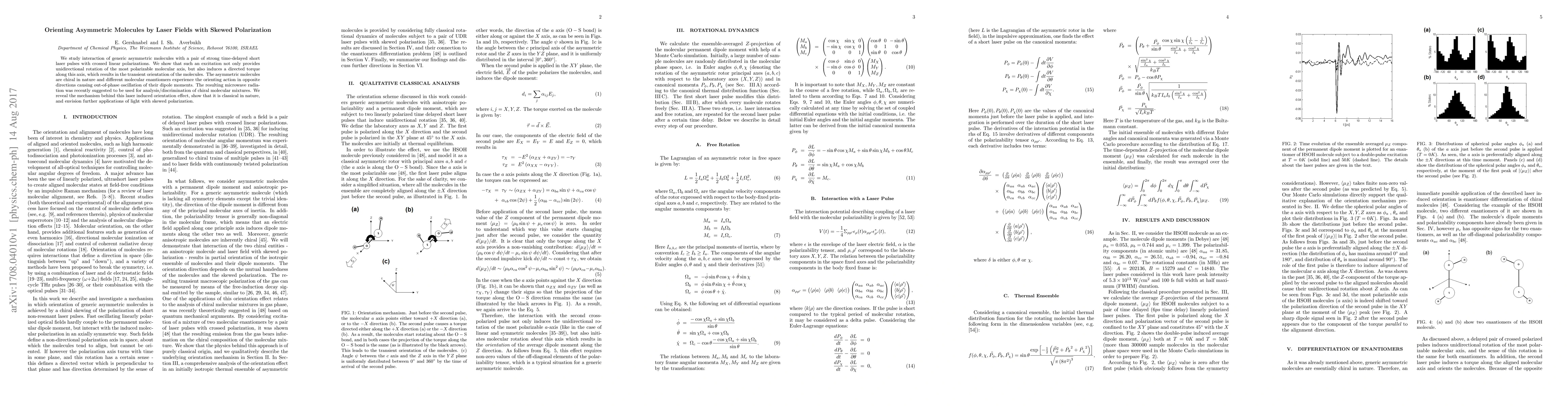 We study interaction of generic asymmetric molecules with a pair of strong time-delayed short laser pulses with crossed linear polarizations. We show that such an excitation not only provides unidirectional rotation of the most polarizable molecular axis, but also induces a directed torque along this axis, which results in the transient orientation of the molecules. The asymmetric molecules are chiral in nature and different molecular enantiomers experience the orienting action in opposite directions causing out-of-phase oscillation of their dipole moments. The resulting microwave radiation was recently suggested to be used for analysis/discrimination of chiral molecular mixtures. We reveal the mechanism behind this laser induced orientation effect, show that it is classical in nature, and envision further applications of light with skewed polarization.