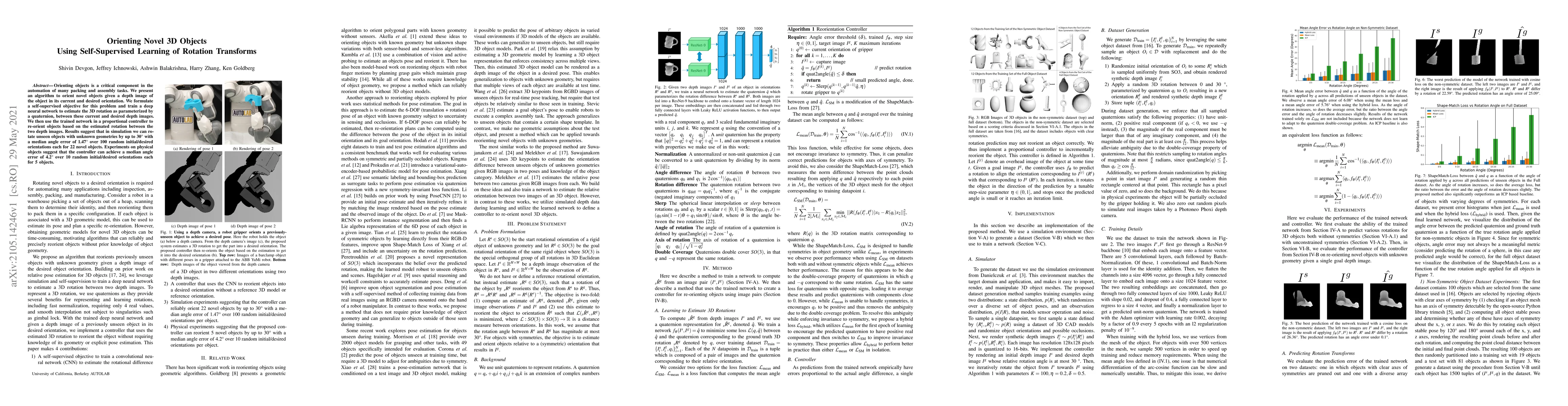 This paper proposes a self-supervised learning algorithm to orient novel 3D objects using depth images, estimating 3D rotations via quaternions. Simulation results show rotation of unseen objects with a median error of 1.47°, while physical experiments achieve a median error of 4.2°.