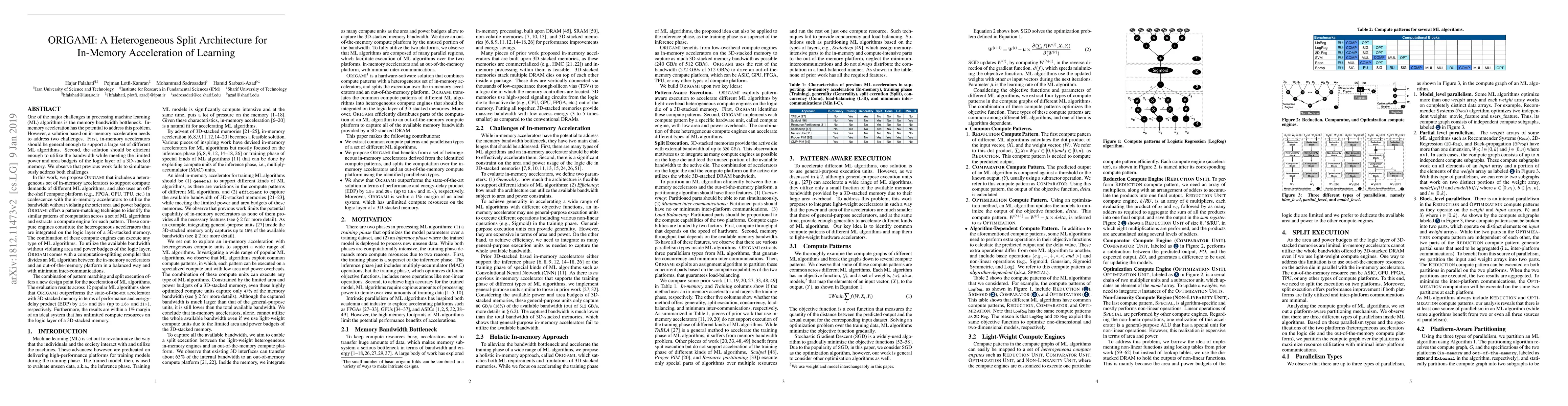 Memory bandwidth bottleneck is a major challenges in processing machine learning (ML) algorithms. In-memory acceleration has potential to address this problem; however, it needs to address two challenges. First, in-memory accelerator should be general enough to support a large set of different ML algorithms. Second, it should be efficient enough to utilize bandwidth while meeting limited power and area budgets of logic layer of a 3D-stacked memory. We observe that previous work fails to simultaneously address both challenges. We propose ORIGAMI, a heterogeneous set of in-memory accelerators, to support compute demands of different ML algorithms, and also uses an off-the-shelf compute platform (e.g.,FPGA,GPU,TPU,etc.) to utilize bandwidth without violating strict area and power budgets. ORIGAMI offers a pattern-matching technique to identify similar computation patterns of ML algorithms and extracts a compute engine for each pattern. These compute engines constitute heterogeneous accelerators integrated on logic layer of a 3D-stacked memory. Combination of these compute engines can execute any type of ML algorithms. To utilize available bandwidth without violating area and power budgets of logic layer, ORIGAMI comes with a computation-splitting compiler that divides an ML algorithm between in-memory accelerators and an out-of-the-memory platform in a balanced way and with minimum inter-communications. Combination of pattern matching and split execution offers a new design point for acceleration of ML algorithms. Evaluation results across 12 popular ML algorithms show that ORIGAMI outperforms state-of-the-art accelerator with 3D-stacked memory in terms of performance and energy-delay product (EDP) by 1.5x and 29x (up to 1.6x and 31x), respectively. Furthermore, results are within a 1% margin of an ideal system that has unlimited compute resources on logic layer of a 3D-stacked memory.