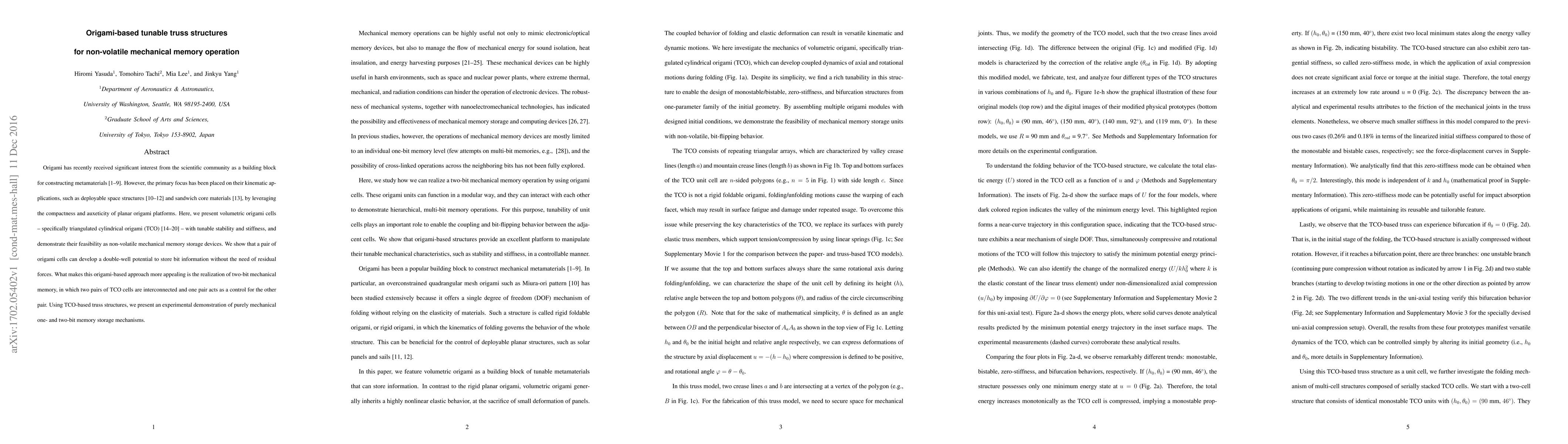 This paper explores the use of triangulated cylindrical origami (TCO) cells for tunable truss structures that serve as non-volatile mechanical memory devices. The study demonstrates the potential of these origami-based structures to store bit information through double-well potentials, and presents a two-bit mechanical memory system using interconnected TCO cells.
