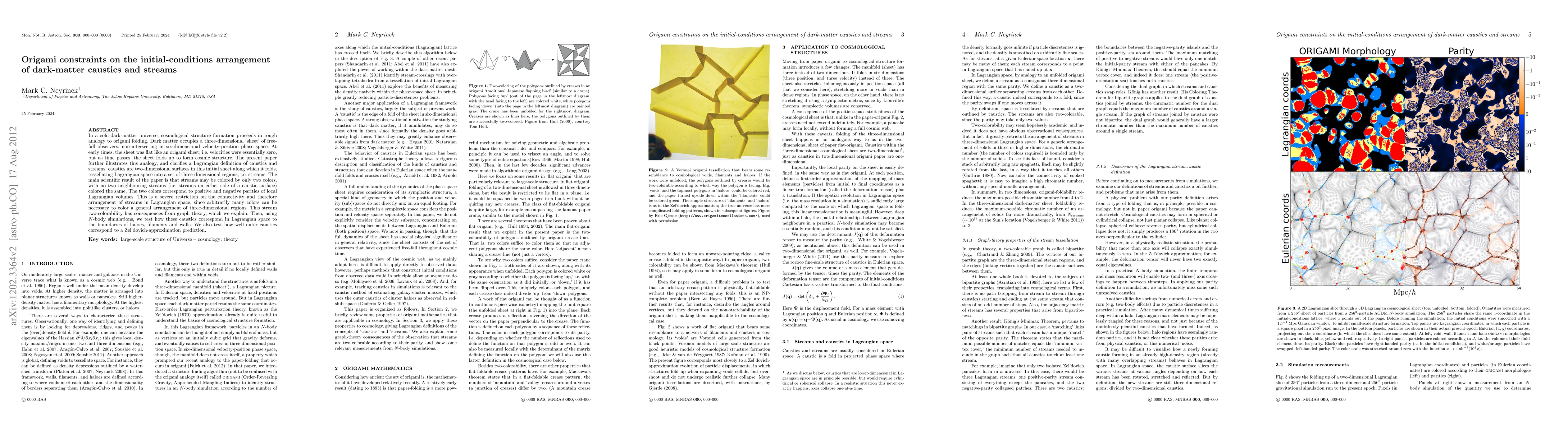 In a cold-dark-matter universe, cosmological structure formation proceeds in rough analogy to origami folding. Dark matter occupies a three-dimensional 'sheet' of free- fall observers, non-intersecting in six-dimensional velocity-position phase space. At early times, the sheet was flat like an origami sheet, i.e. velocities were essentially zero, but as time passes, the sheet folds up to form cosmic structure. The present paper further illustrates this analogy, and clarifies a Lagrangian definition of caustics and streams: caustics are two-dimensional surfaces in this initial sheet along which it folds, tessellating Lagrangian space into a set of three-dimensional regions, i.e. streams. The main scientific result of the paper is that streams may be colored by only two colors, with no two neighbouring streams (i.e. streams on either side of a caustic surface) colored the same. The two colors correspond to positive and negative parities of local Lagrangian volumes. This is a severe restriction on the connectivity and therefore arrangement of streams in Lagrangian space, since arbitrarily many colors can be necessary to color a general arrangement of three-dimensional regions. This stream two-colorability has consequences from graph theory, which we explain. Then, using N-body simulations, we test how these caustics correspond in Lagrangian space to the boundaries of haloes, filaments and walls. We also test how well outer caustics correspond to a Zel'dovich-approximation prediction.