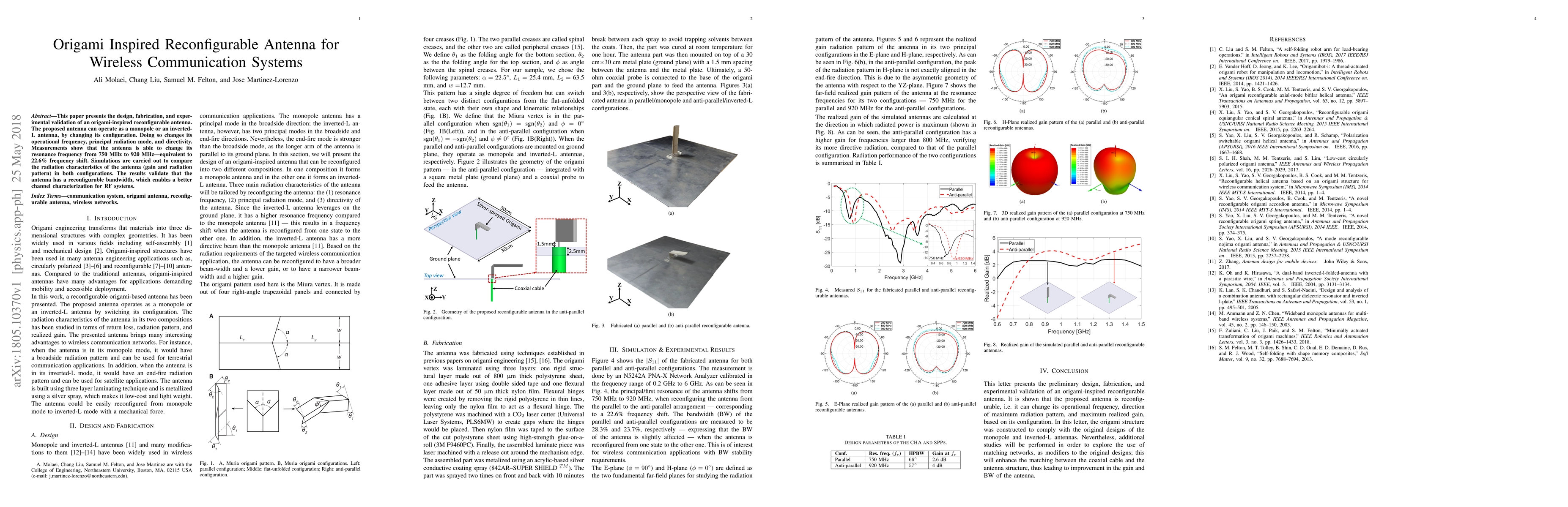 This paper introduces an origami-inspired reconfigurable antenna that can switch between monopole and inverted-L configurations, altering its operational frequency, radiation mode, and directivity. Experimental results demonstrate a 22.6% frequency shift from 750 MHz to 920 MHz, validating its reconfigurable bandwidth for enhanced RF system performance.
